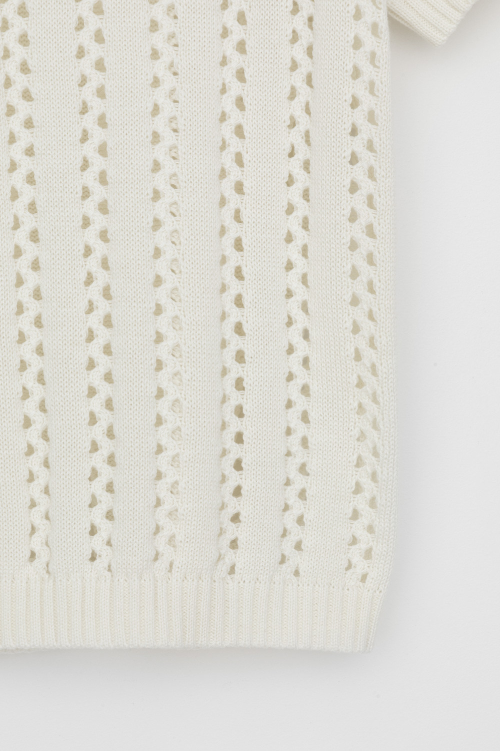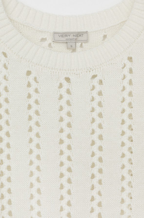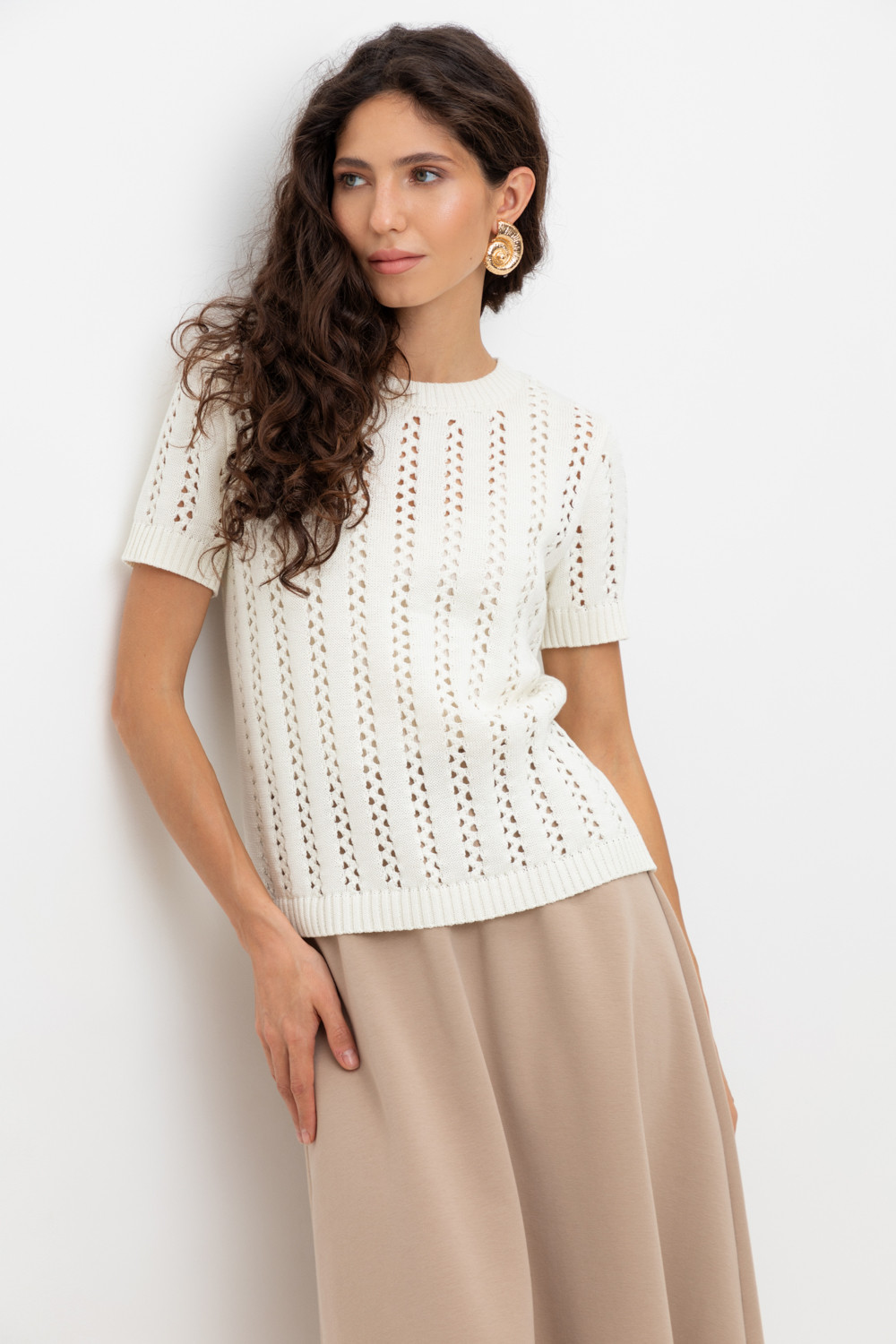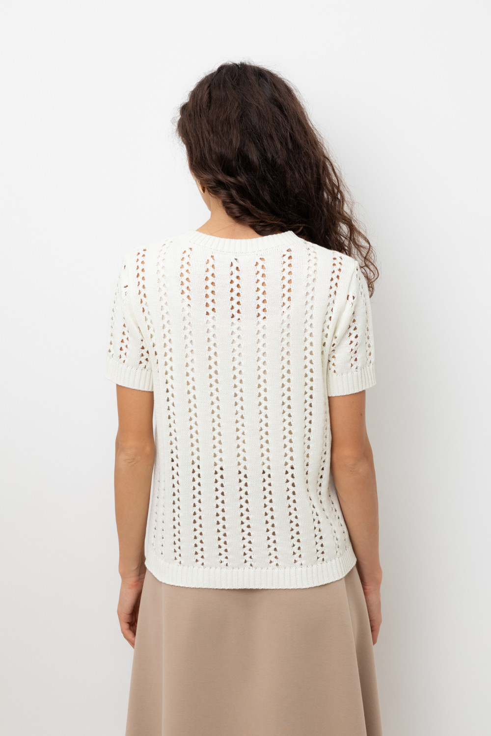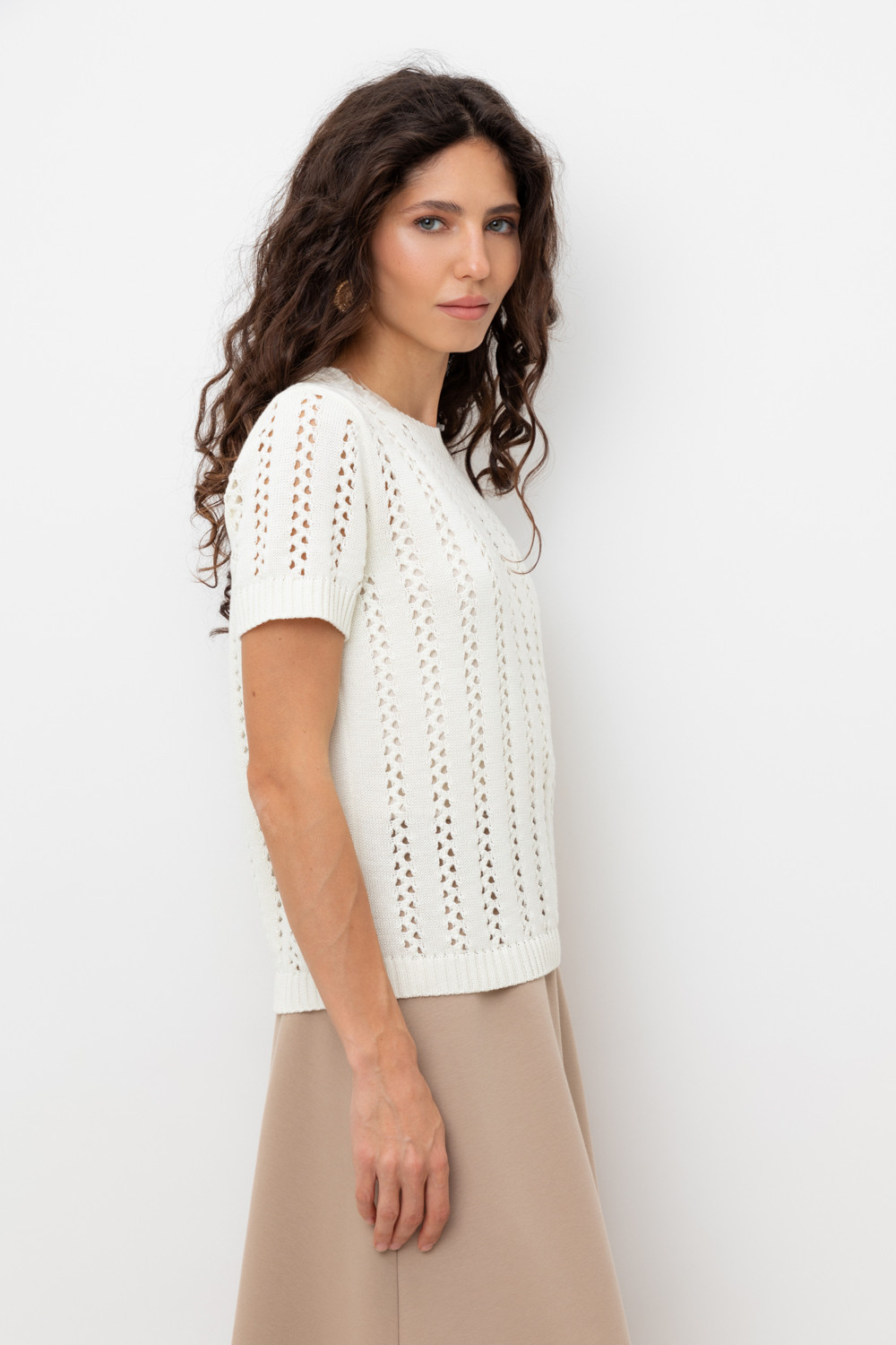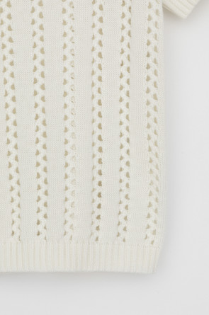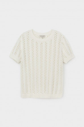 Джемпер из итальянской хлопковой пряжи выполнен ажурной, воздушной вязкой. Молочный цвет и фактура делают его универсальным для различных образов.