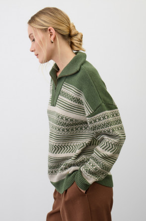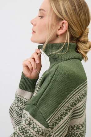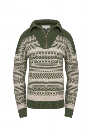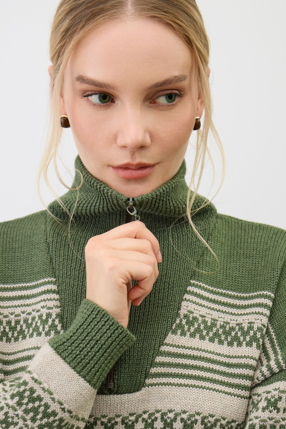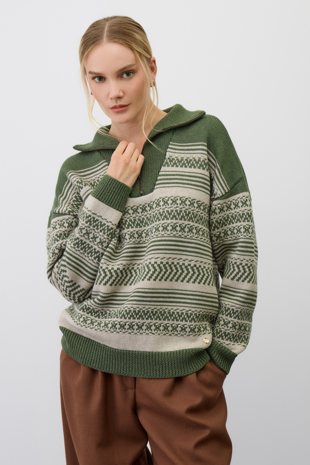 Изысканный джемпер в скандинавском стиле создан из высококачественной пряжи с применением передовой технологии смешанных волокон. Тонкое сочетание шерсти и акрила создает непревзойденный комфорт: модель мягко подчеркивает силуэт, обеспечивает нежное прикосновение и сохраняет безупречную посадку. Стильный воротник-стойка с элегантной застежкой-молнией завершает продуманный дизайн.