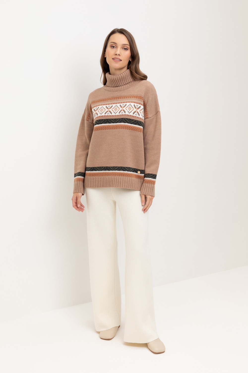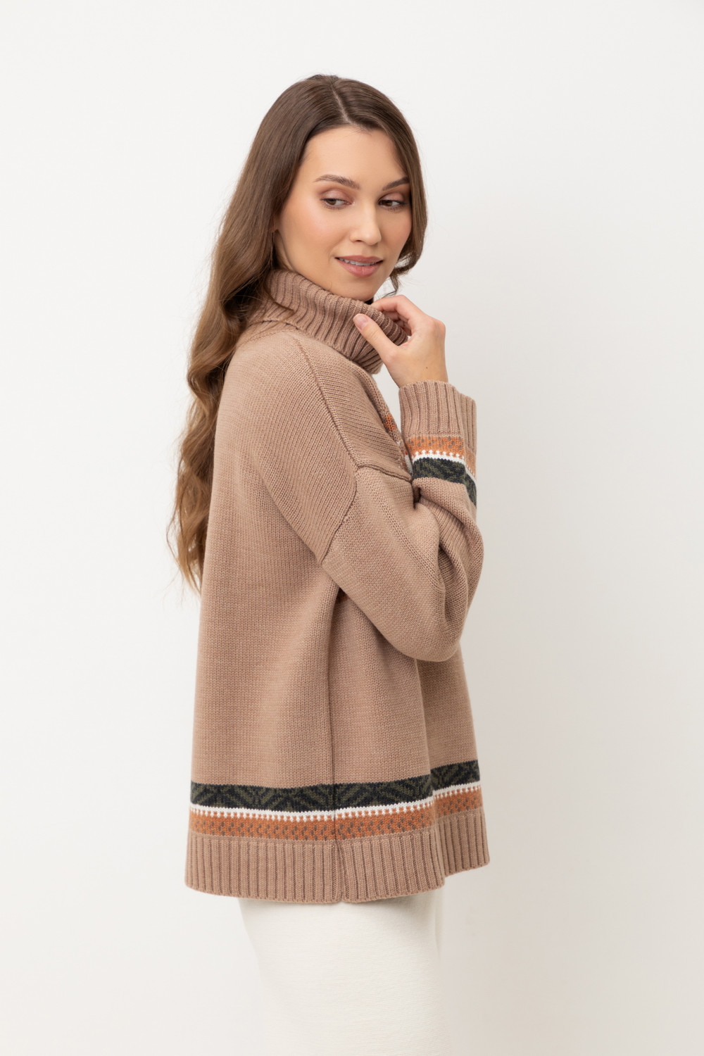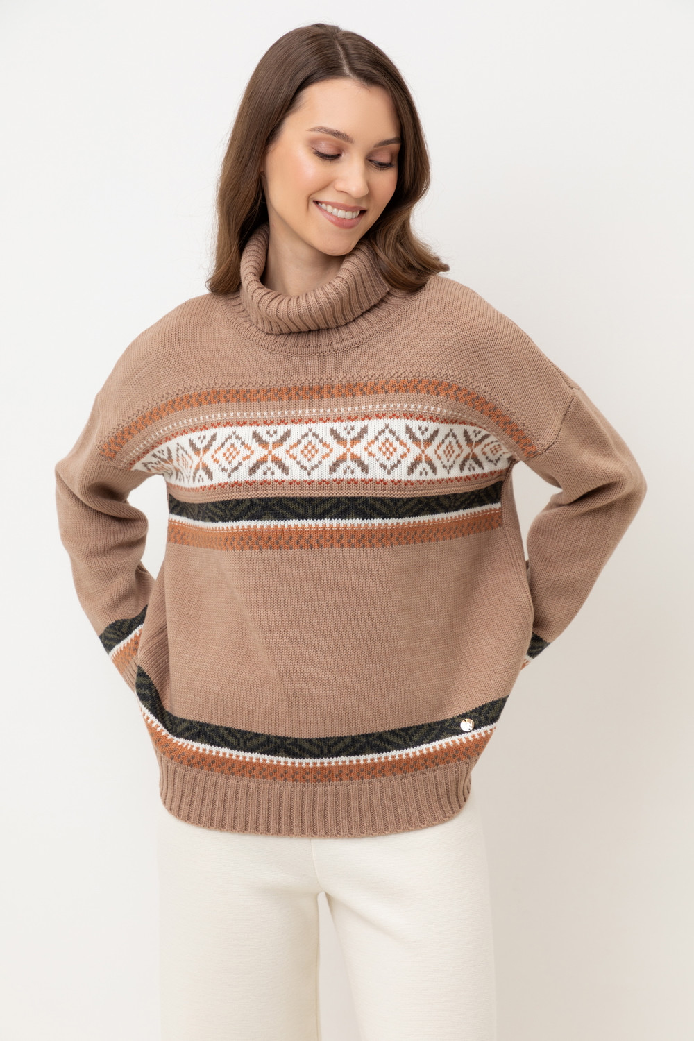 Мягкий джемпер в скандинавском стиле выполнен из пряжи премиум-класса. Идеальное сочетание шерсти и акрила обеспечивает комфорт, нежно облегает тело, является гипоаллергенным и прекрасно сохраняет свою форму.