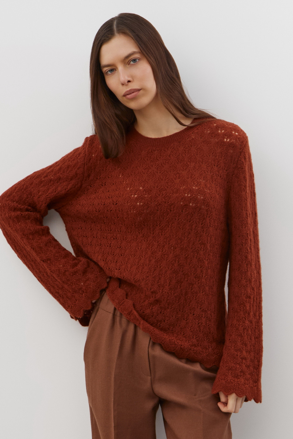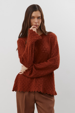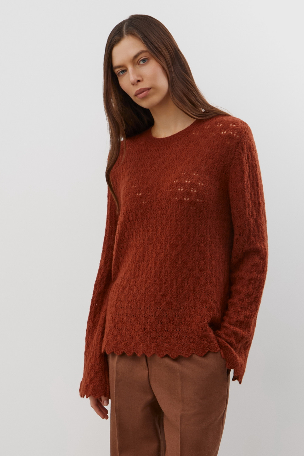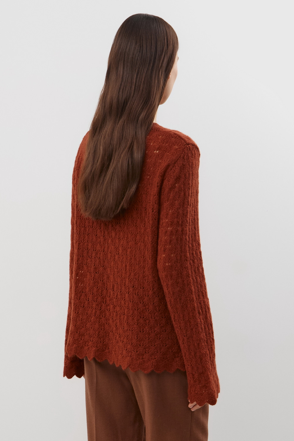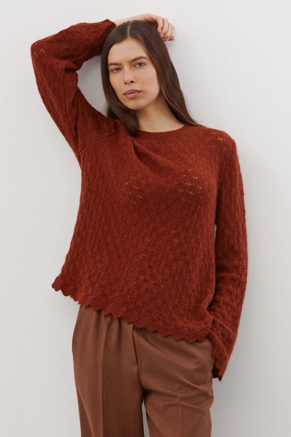 Ажурный джемпер из мериносовой шерсти и мохера — идеальный выбор для ценителей качества и стиля. Изысканное сочетание натуральных материалов и акрила создает непревзойденный комфорт: модель деликатно подчеркивает силуэт, обеспечивает нежное прикосновение к коже и сохраняет безупречный внешний вид.