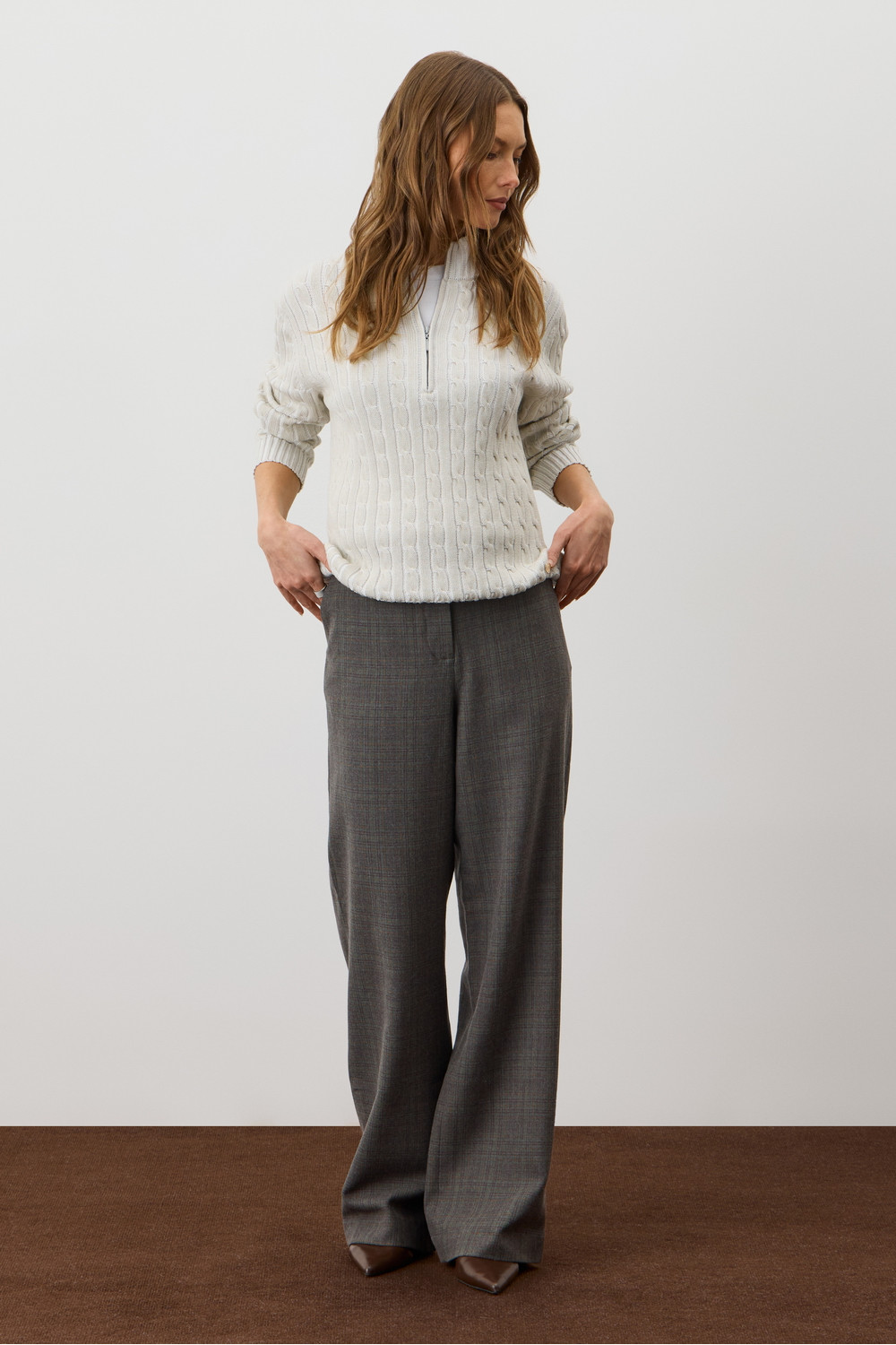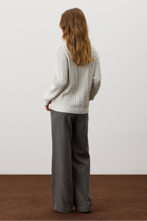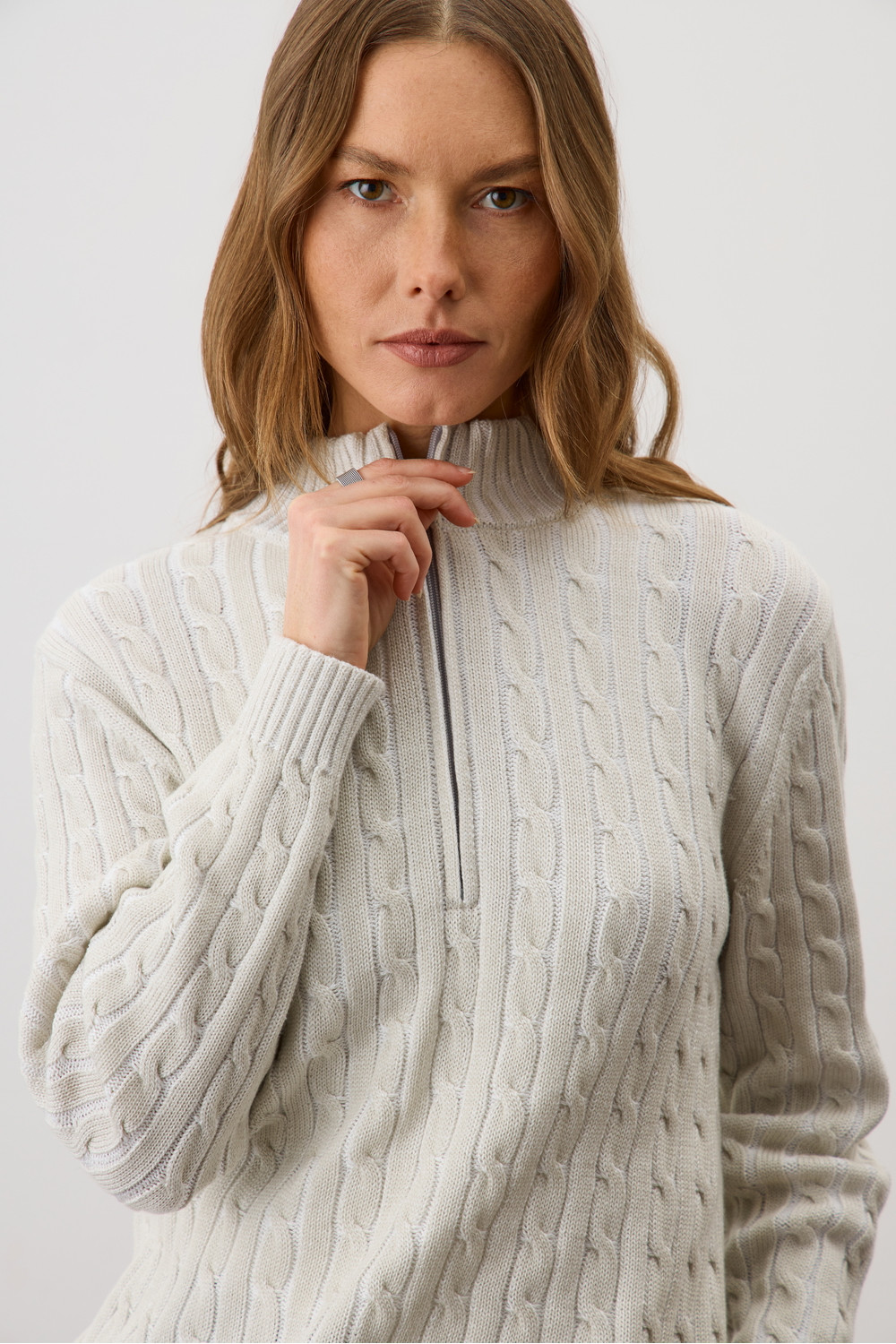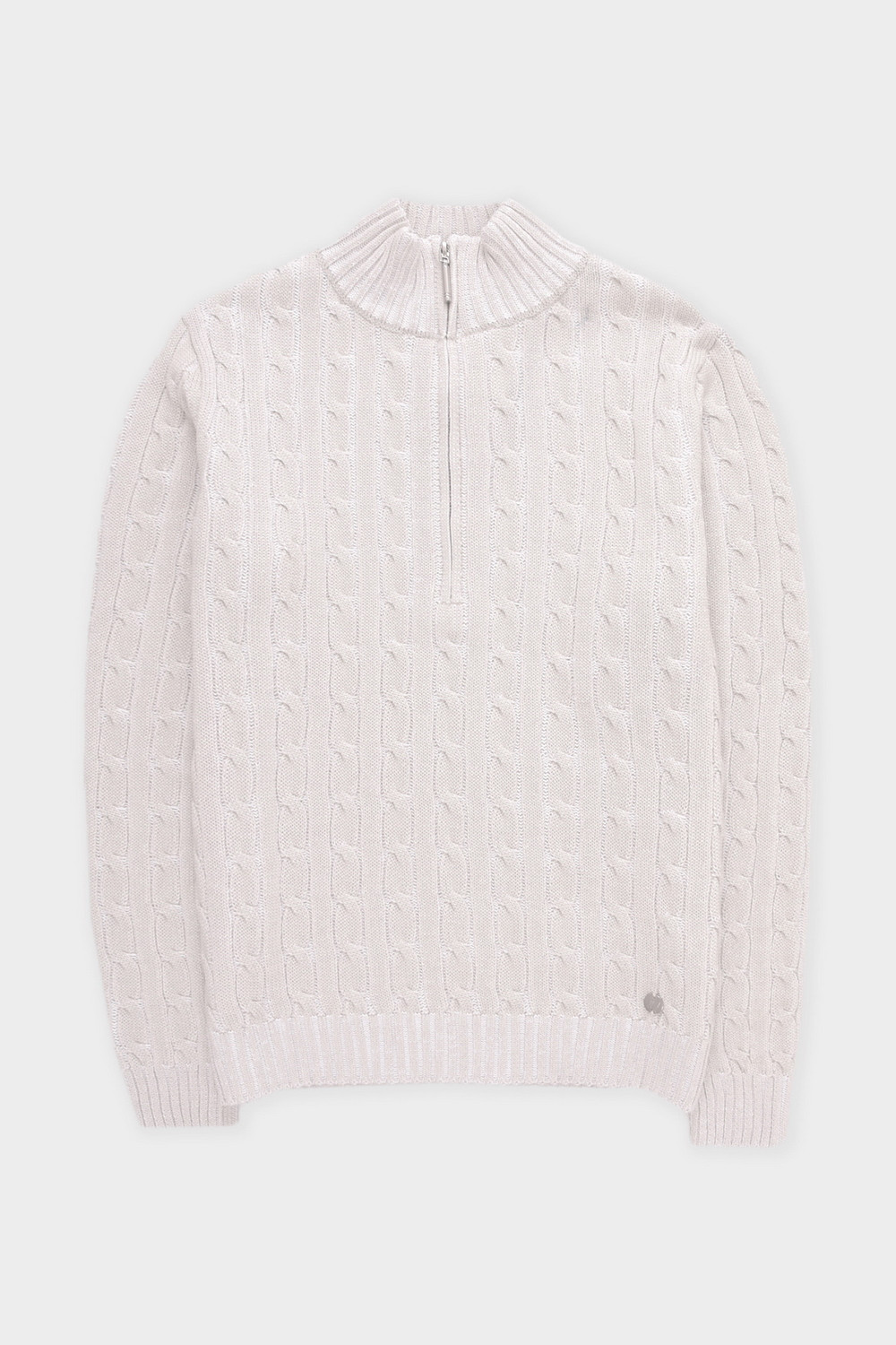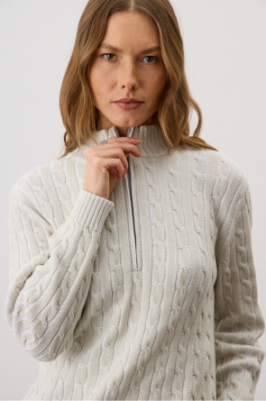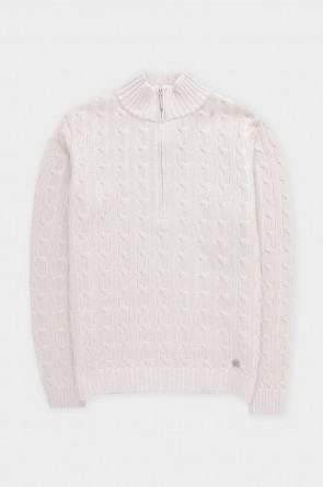 Джемпер с воротником на молнии является лаконичной базой. Комфортный тандем вязки косами и расслабленного кроя становится стильным дополнением различным образам. Джемпер создан из хлопковой пряжи и прошел дополнительную обработку по итальянской технологии, это гарантирует минимальную усадку во время носки. Акрил в составе не позволяет изделию пилинговаться.