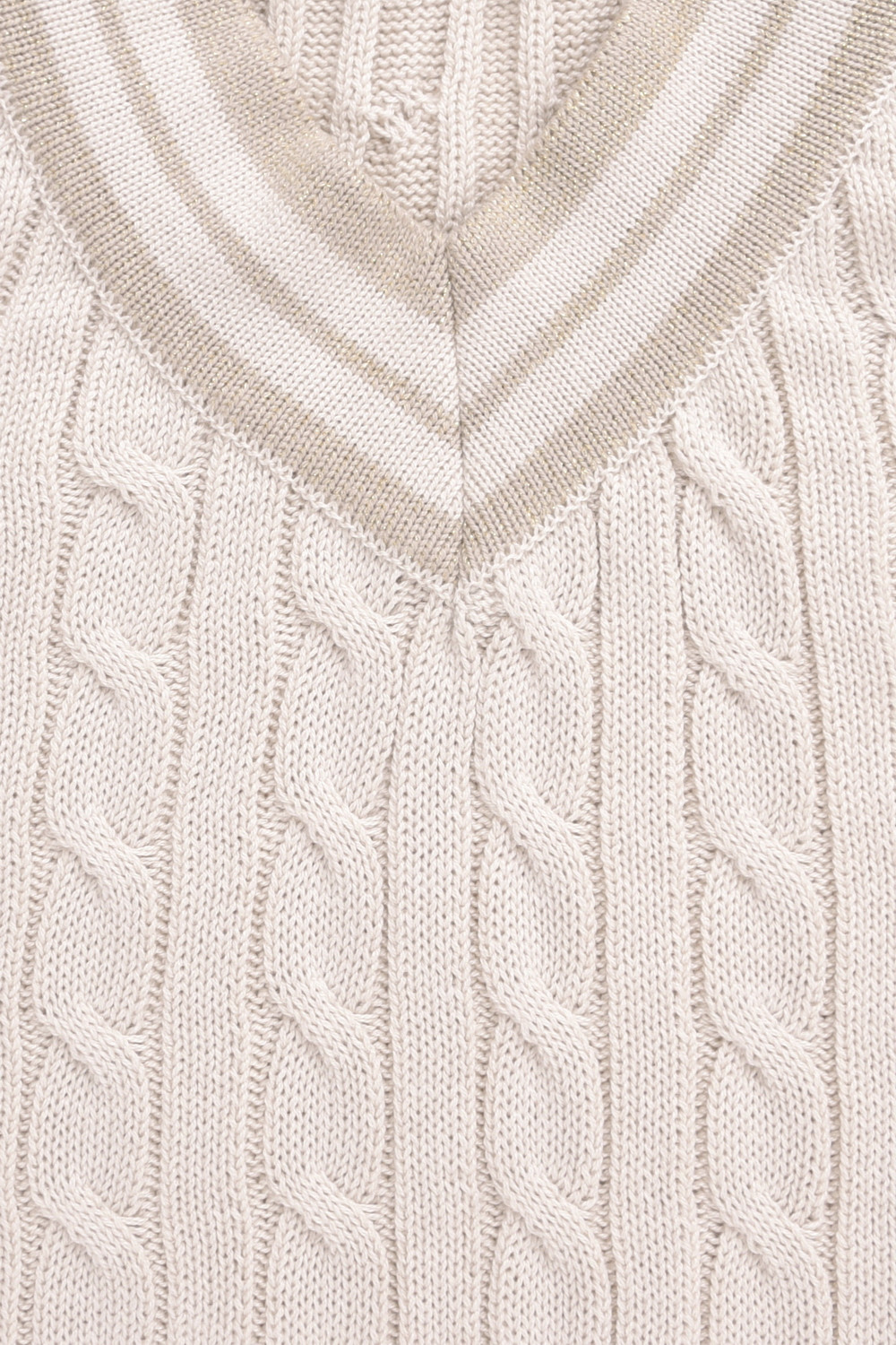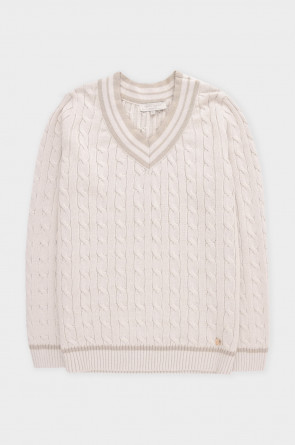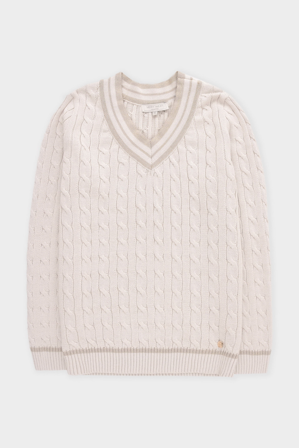 Хлопковый джемпер дополняет классический вырез, а вязка косами элегантно завершает изделие. Джемпер прошел дополнительную обработку по итальянской технологии, это гарантирует минимальную усадку во время носки. Акрил в составе не позволяет изделию пилинговаться.