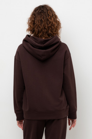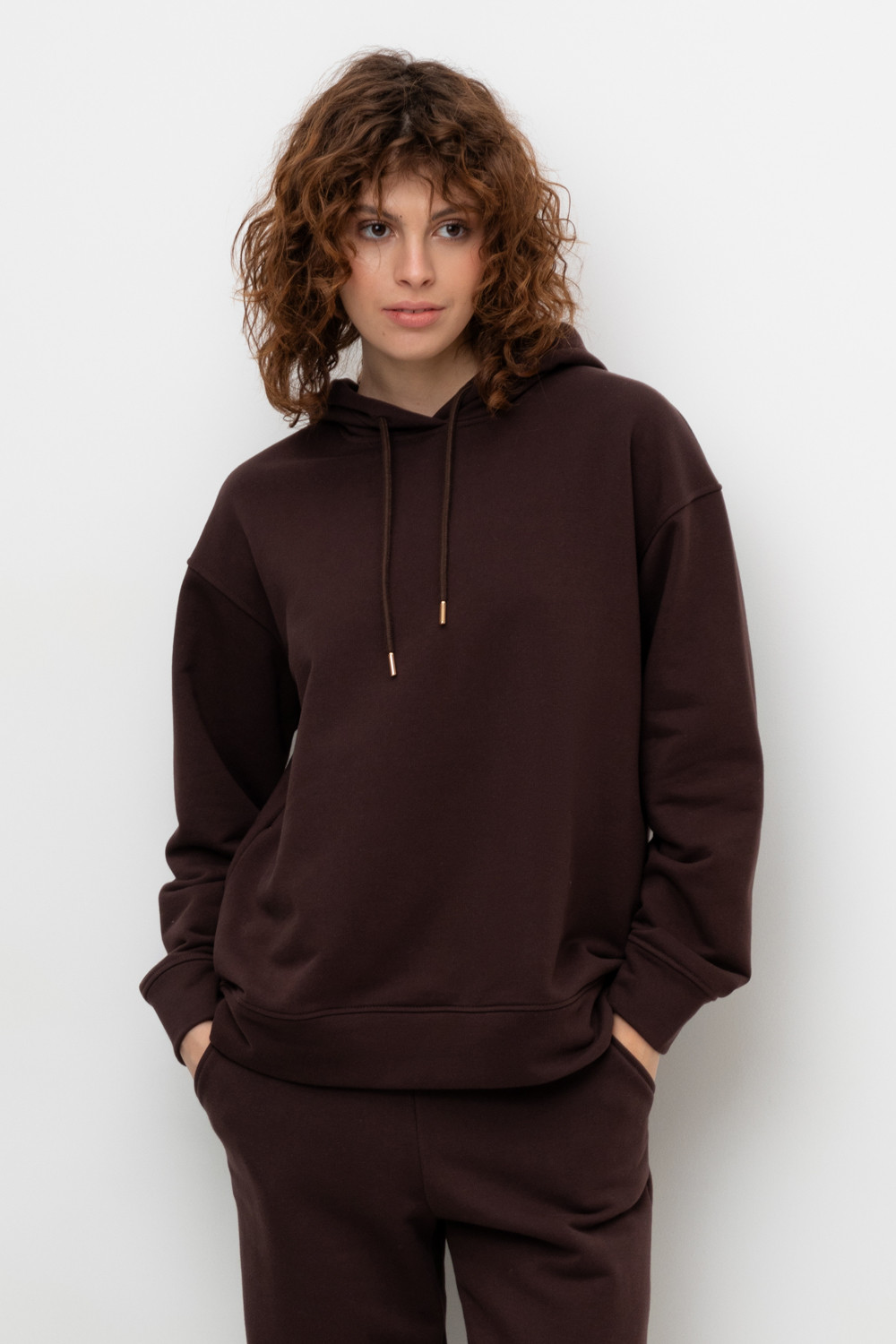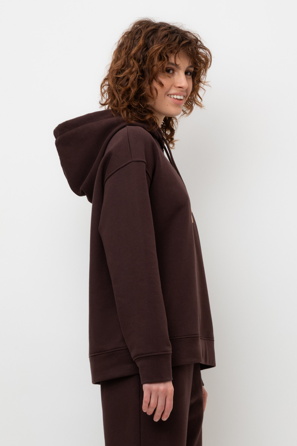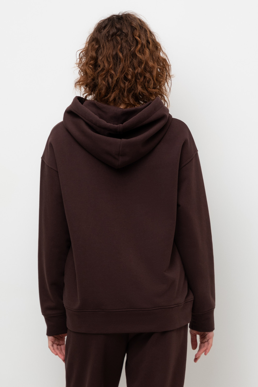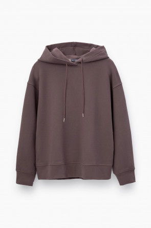 Толстовка с капюшоном и боковыми карманами из петельчатого футера трехнитки. В составе 80% натурального хлопка и 20% полиэстера, при этом полиэстер ввязан внутрь по особой технологии и не соприкасается с кожей. Спущенные рукава, манжеты из основного полотна. Свободный силуэт.
