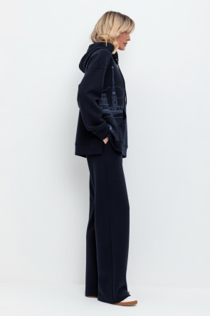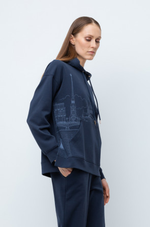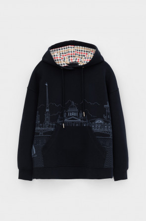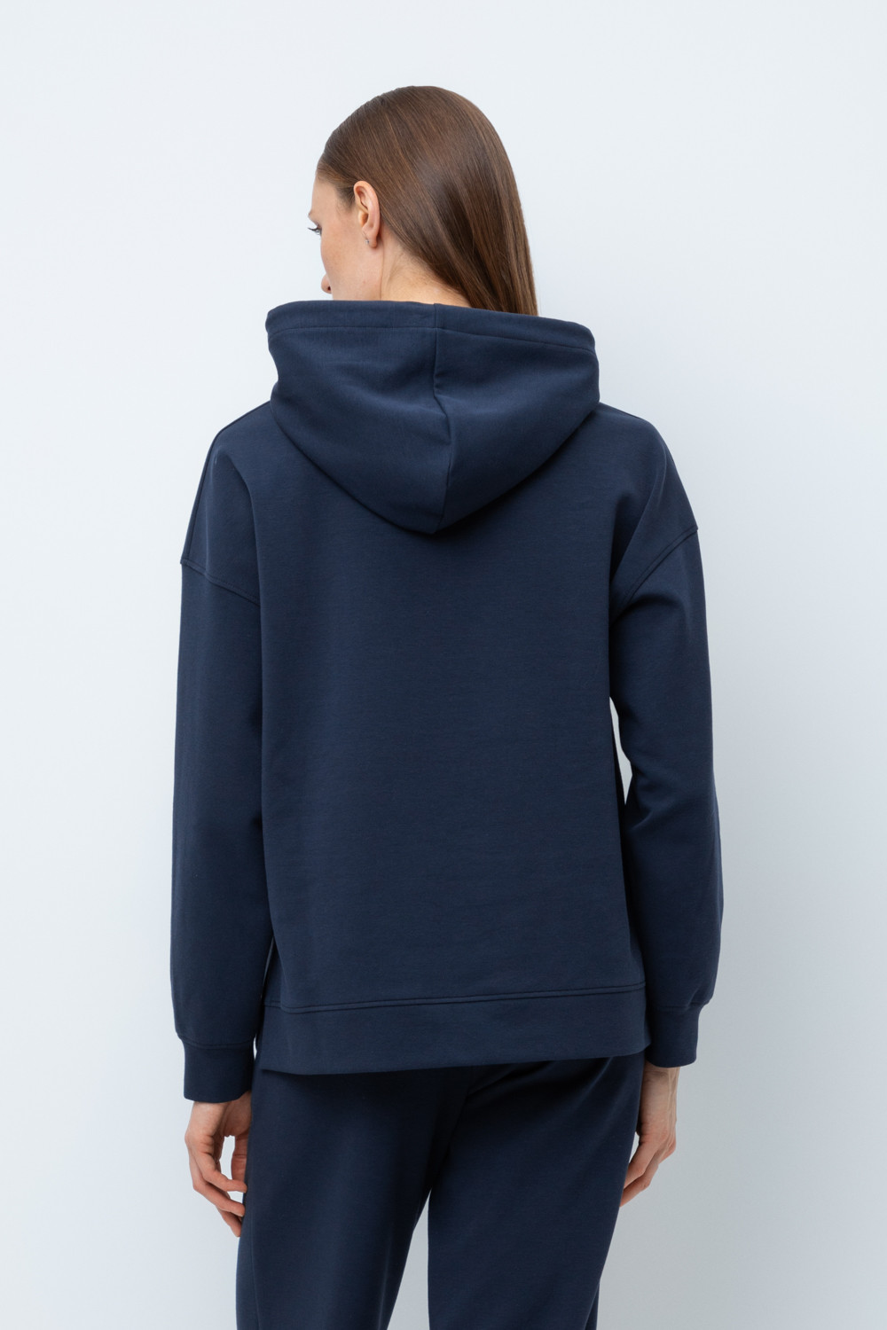 Женская толстовка-оверсайз из плотного гладкого трикотажа интерлок со спандексом. Капюшон регулируется с помощью шнура. У изделия свободная посадка, карман-кенгуру, манжеты. По бокам разрезы. Гладкий и плотный материал на основе хлопка сохраняет форму.