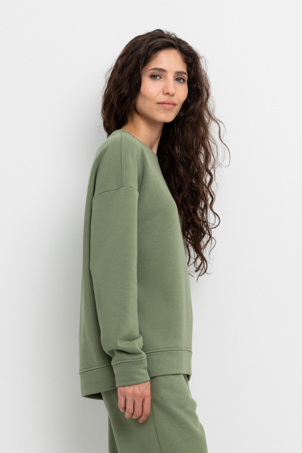 Мягкая женская толстовка из футера трехнитки. Спущенные рукава и манжеты добавляют объем.
