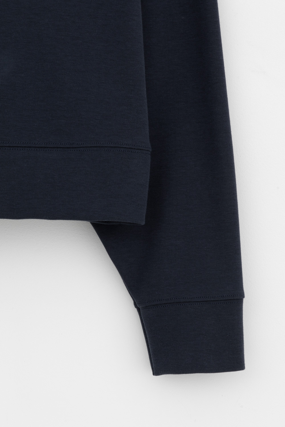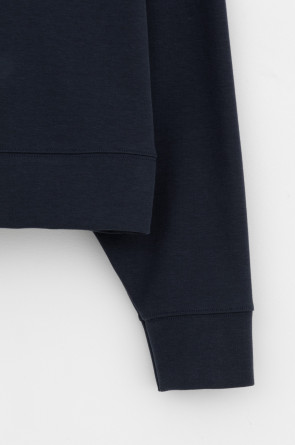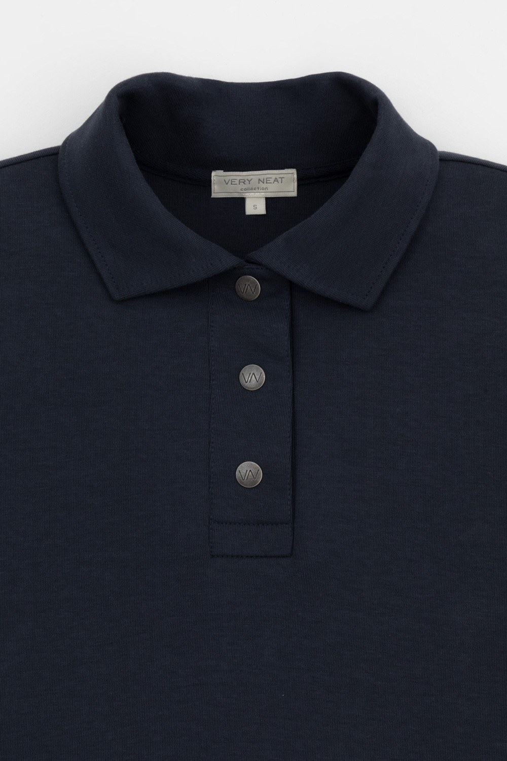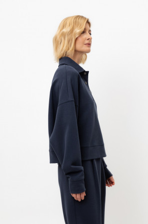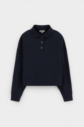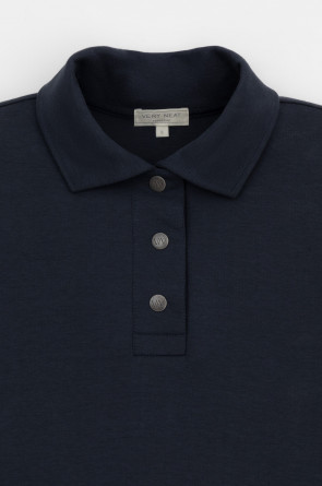 Джемпер-поло из высококачественного трикотажного полотна. За счет фактуры переплетения и специальных обработок сохраняют силуэт и форму. Хлопок в составе добавляет комфорт при носке. Выделяется благодаря спущенной линии плеча, что отличает его от традиционных моделей. Широкие манжеты и пояс формируют расслабленный стиль.