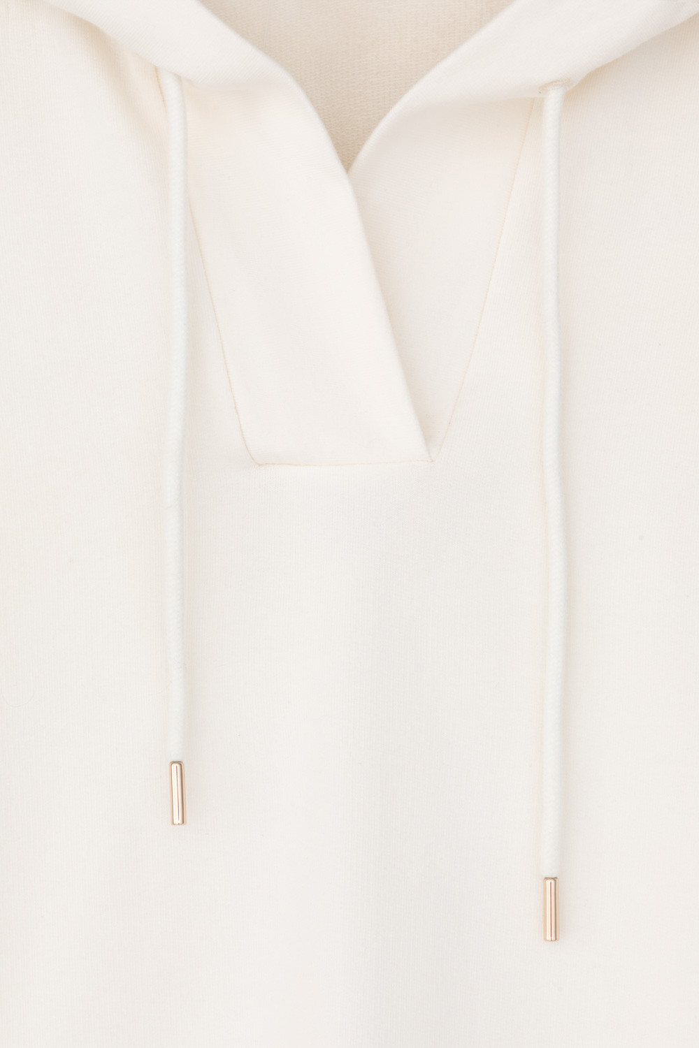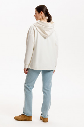 Подарите себе ощущение комфорта и уюта с худи из мягкого эластичного футера в теплом молочном оттенке. Спущенные плечи, удлиненная спинка и объёмный капюшон в сочетании с вместительными карманами придают изделию расслабленный вид.