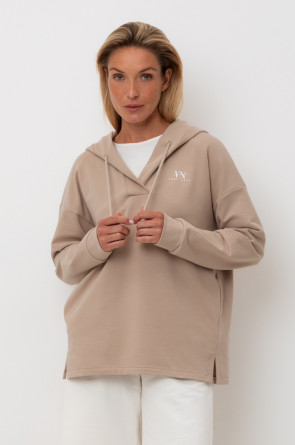 Подарите себе ощущение комфорта и уюта с худи из мягкого эластичного футера в теплом песочном оттенке. Спущенные плечи, удлиненная спинка и объёмный капюшон в сочетании с вместительными карманами придают изделию расслабленный вид.