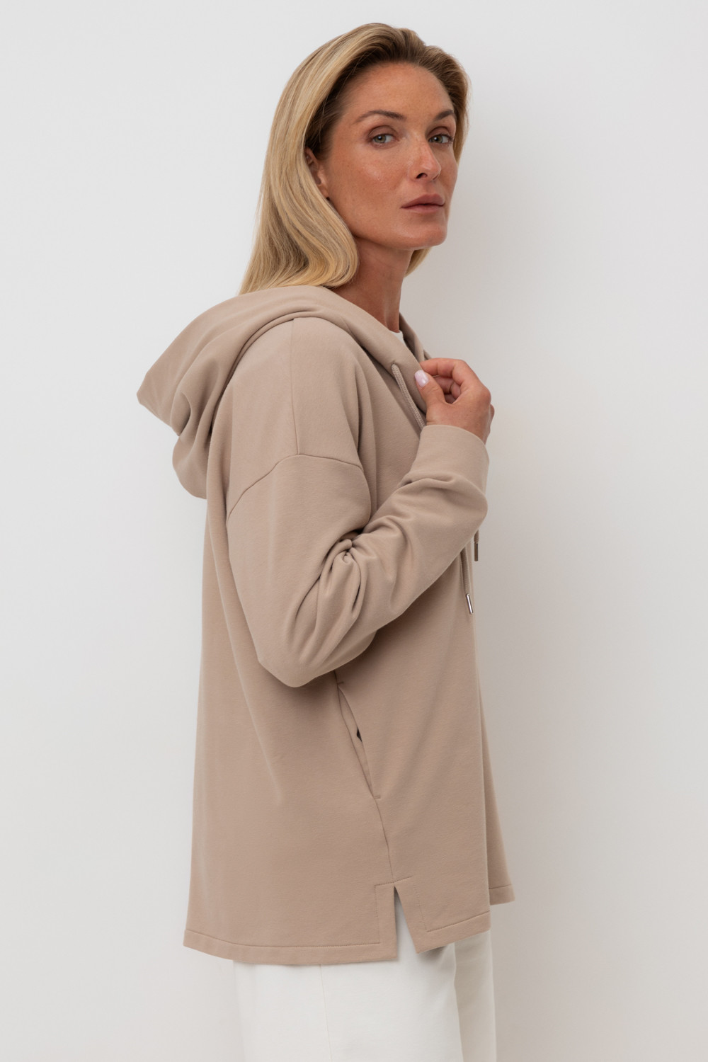 Подарите себе ощущение комфорта и уюта с худи из мягкого эластичного футера в теплом песочном оттенке. Спущенные плечи, удлиненная спинка и объёмный капюшон в сочетании с вместительными карманами придают изделию расслабленный вид.