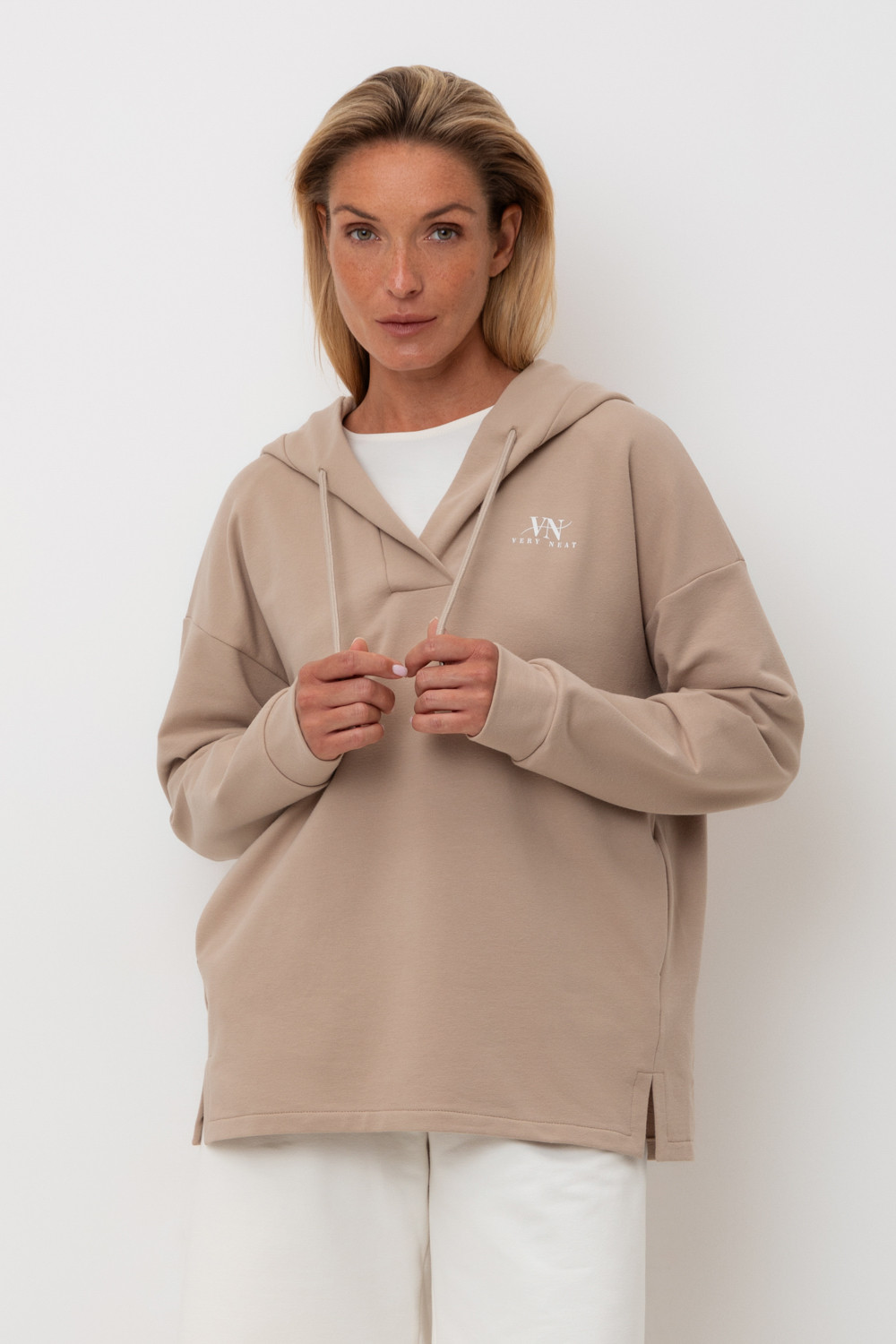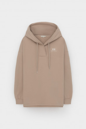 Подарите себе ощущение комфорта и уюта с худи из мягкого эластичного футера в теплом песочном оттенке. Спущенные плечи, удлиненная спинка и объёмный капюшон в сочетании с вместительными карманами придают изделию расслабленный вид.