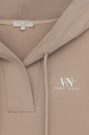 Подарите себе ощущение комфорта и уюта с худи из мягкого эластичного футера в теплом песочном оттенке. Спущенные плечи, удлиненная спинка и объёмный капюшон в сочетании с вместительными карманами придают изделию расслабленный вид.