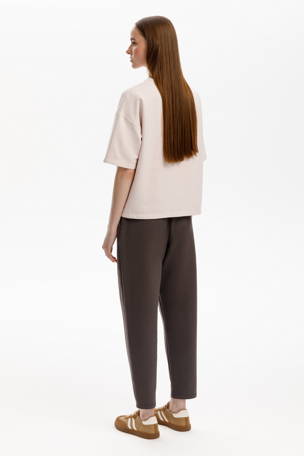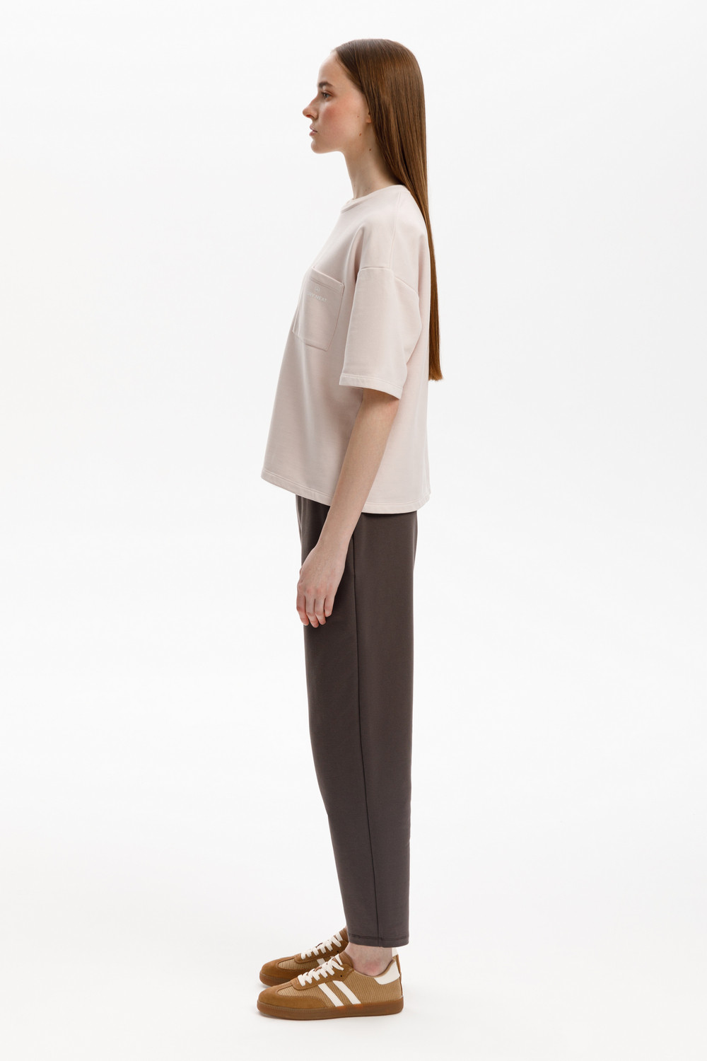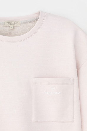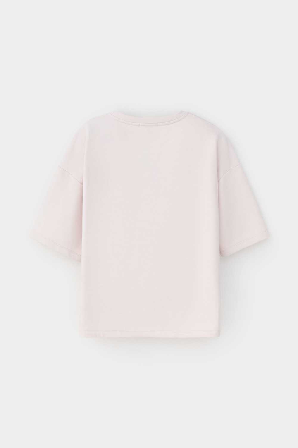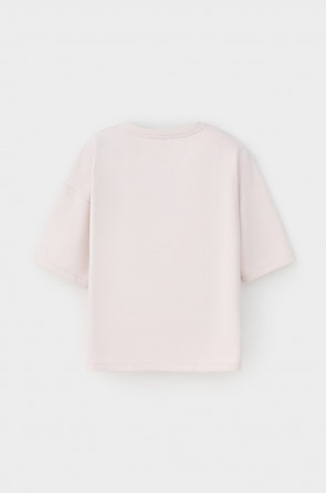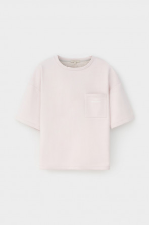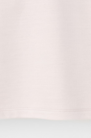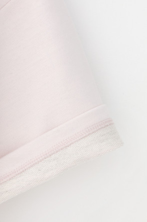 Футболка из мягкого двухцветного футера. Внутренняя сторона изделия представлена в натуральном цвете хлопка, внешняя в нежно-розовом. За счет использования крашенной пряжи, данный вид полотна прошел минимальную обработку, что придало изделию мягкость и шелковистость.