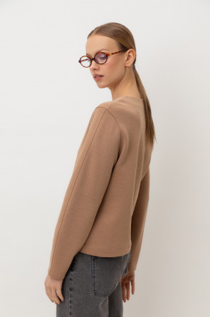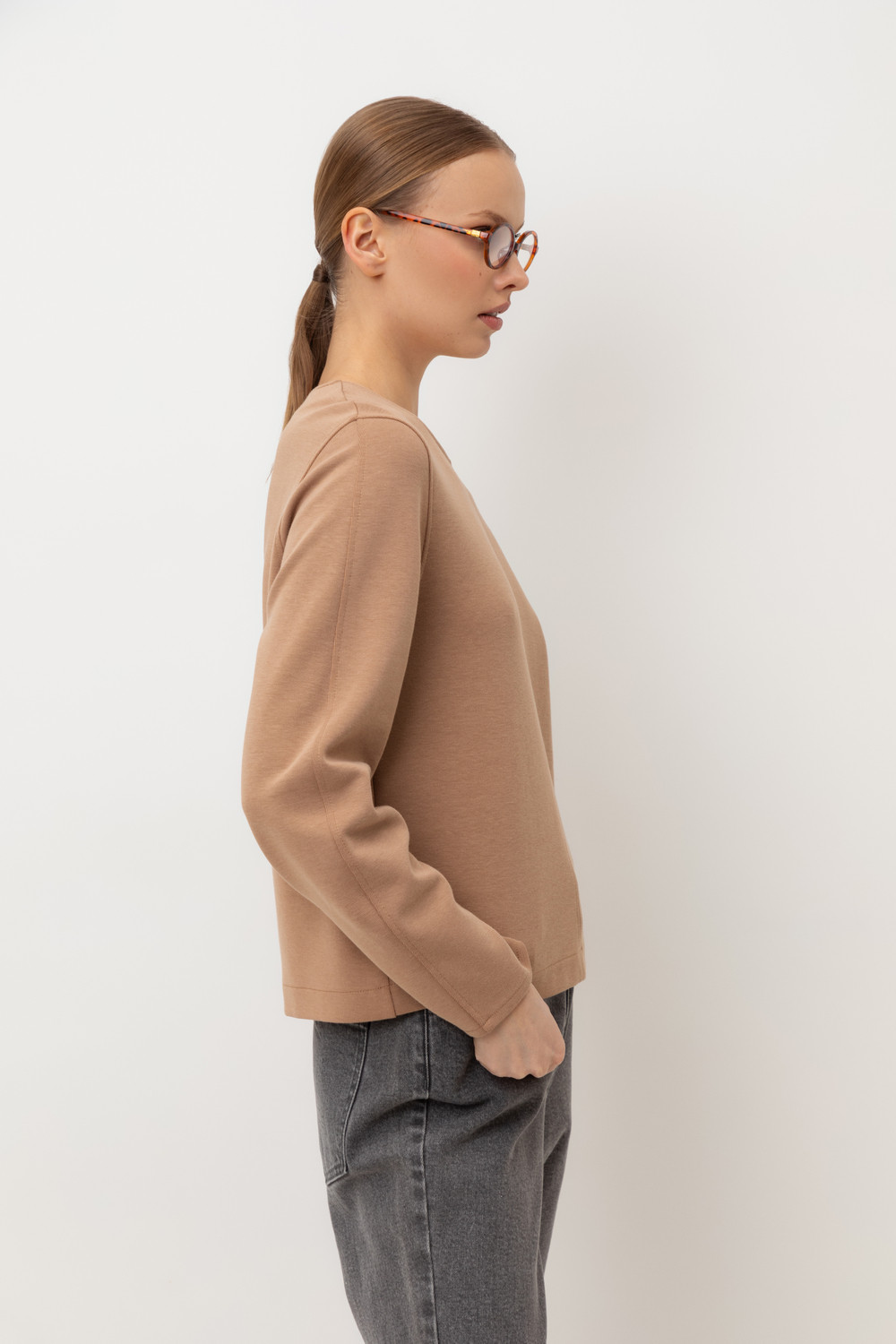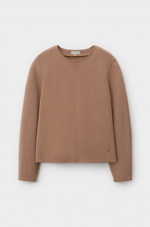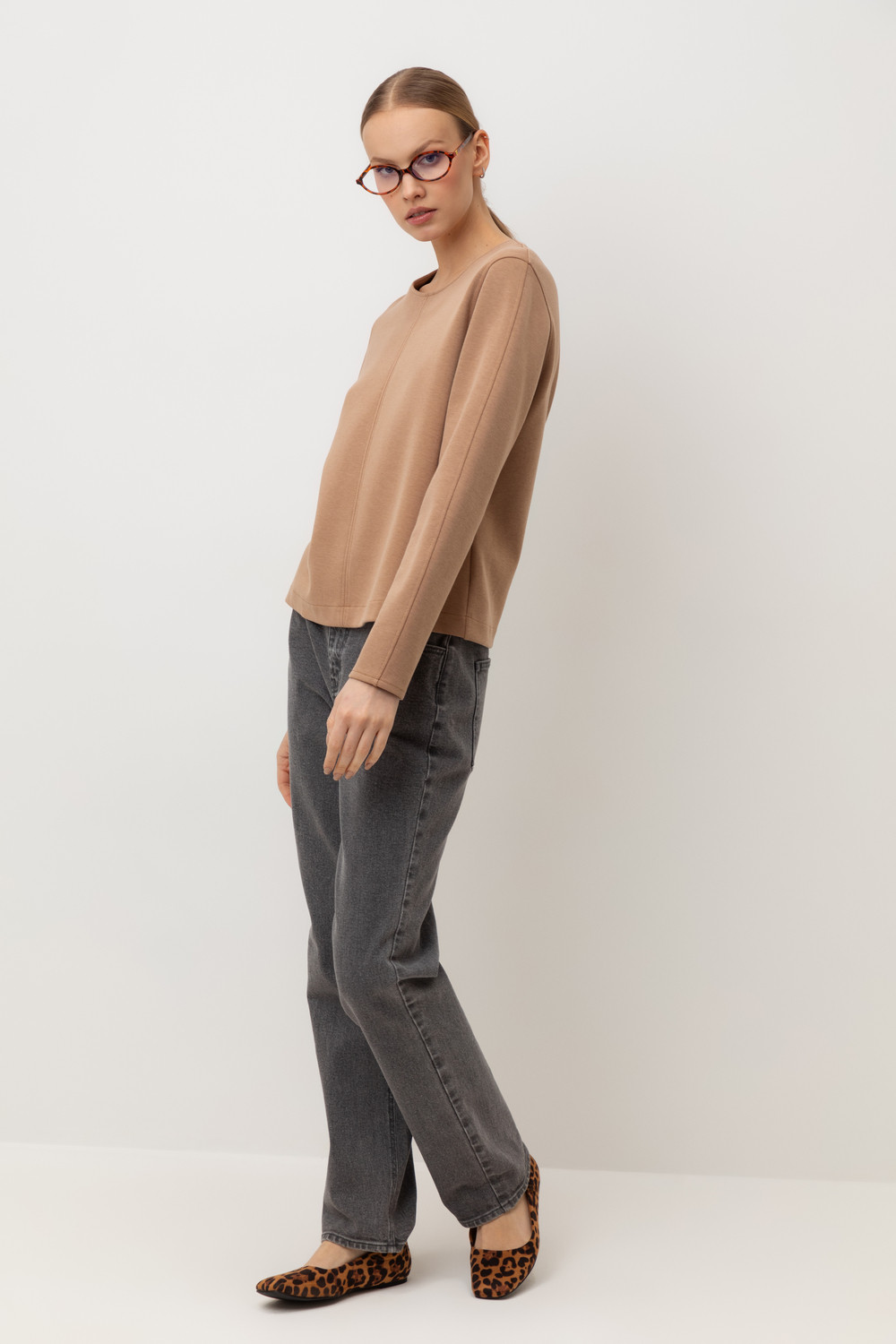 Модель имеет классический круглый вырез, что делает ее универсальной. Удобный прямой крой и рельефный шов, расположенный по центру, добавляют изделию оригинальности.