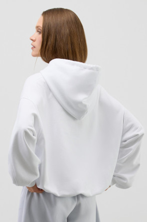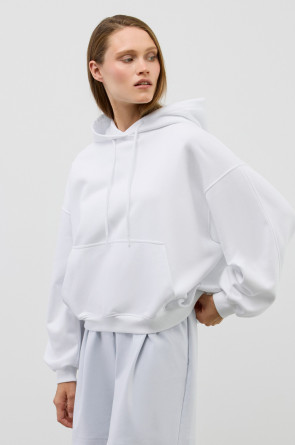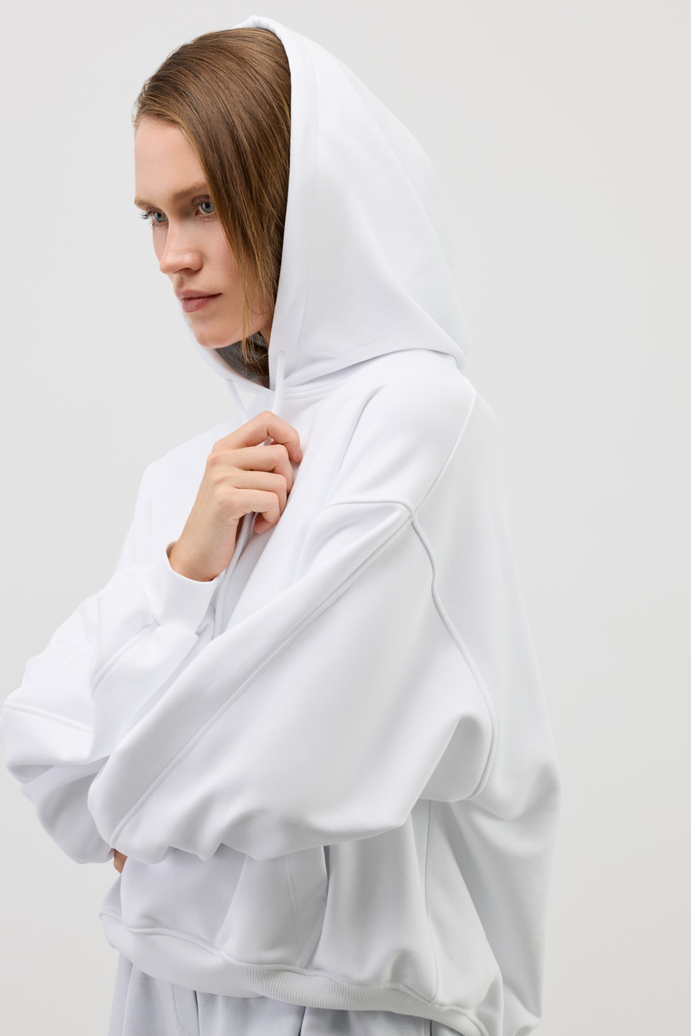 Худи из мягкого хлопкового футера для расслабленных образов. Для еще большего комфорта изделие дополняют спущенная линия плеч, объёмный капюшон и в вместительный накладной карман.