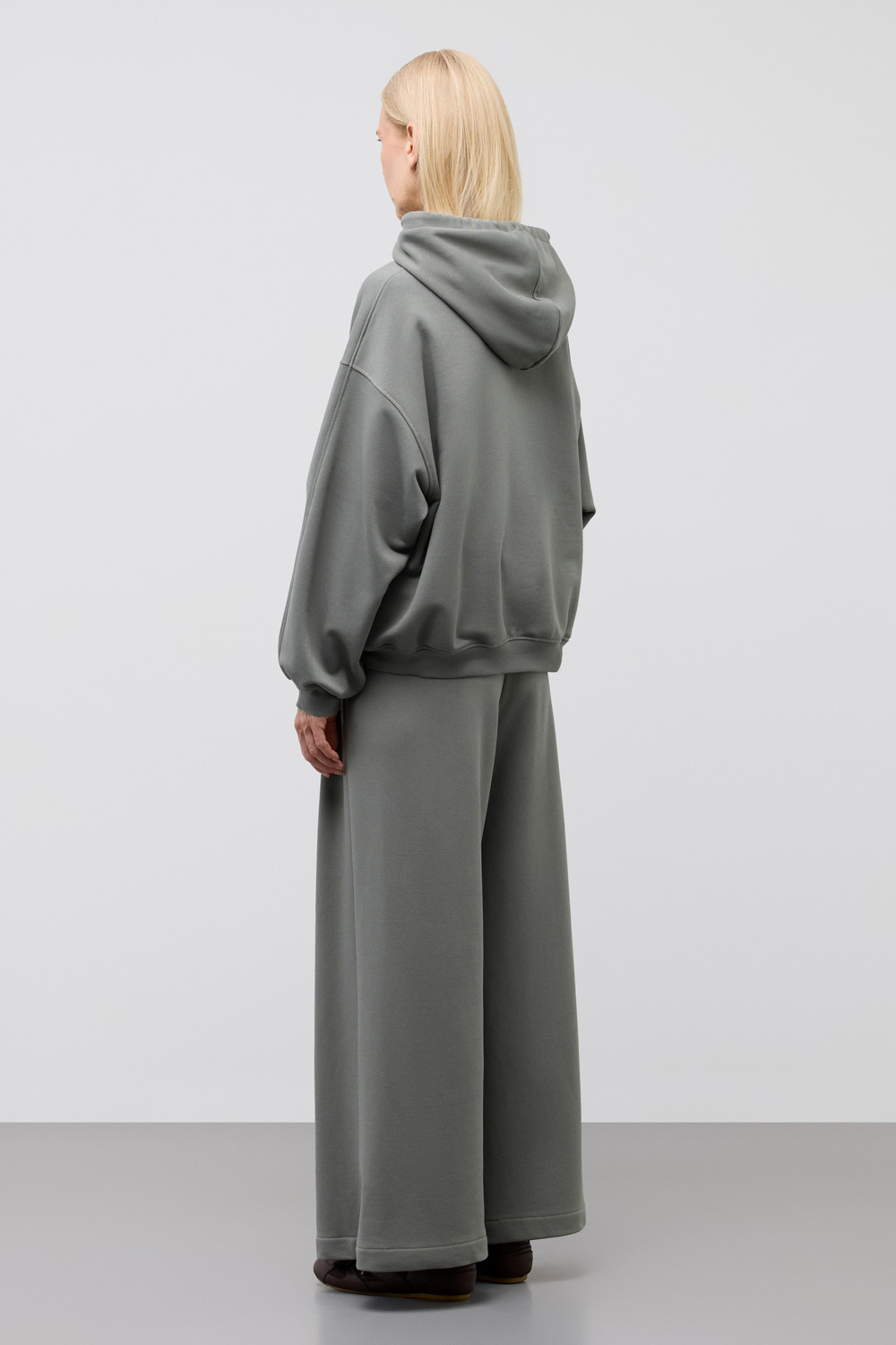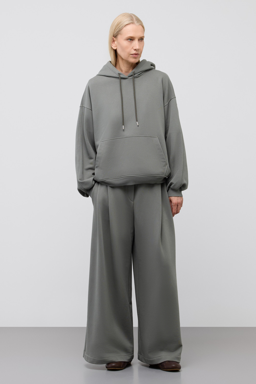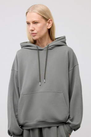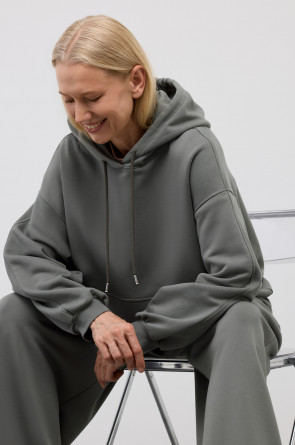 Худи из мягкого хлопкового футера для расслабленных образов. Для еще большего комфорта изделие дополняют спущенная линия плеч, объёмный капюшон и в вместительный накладной карман.
