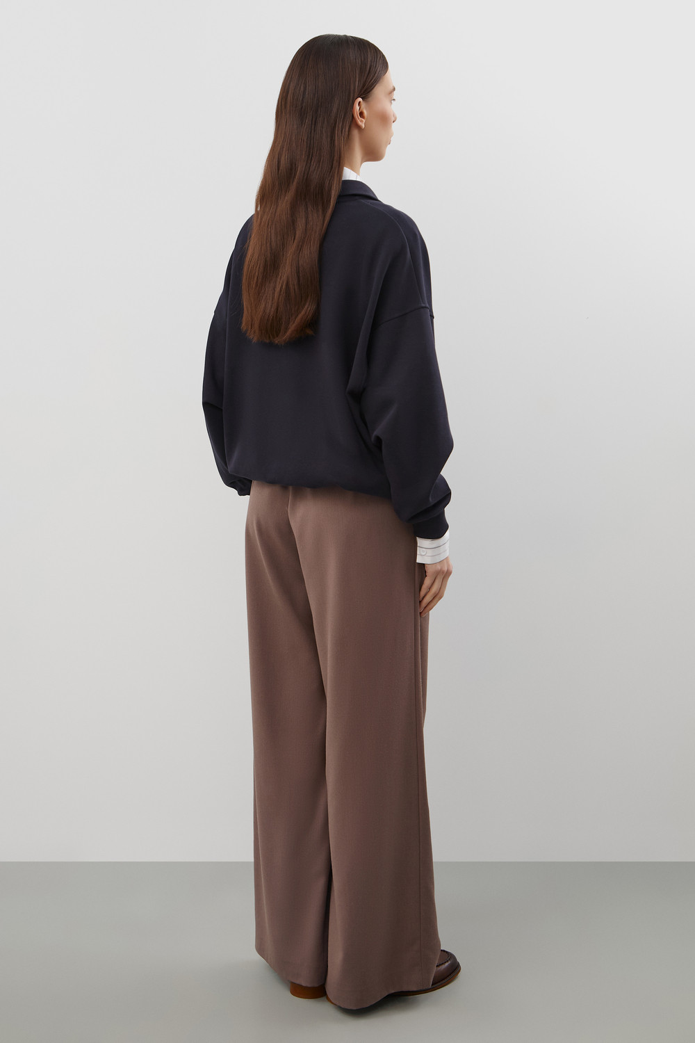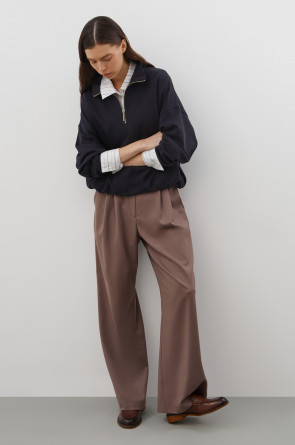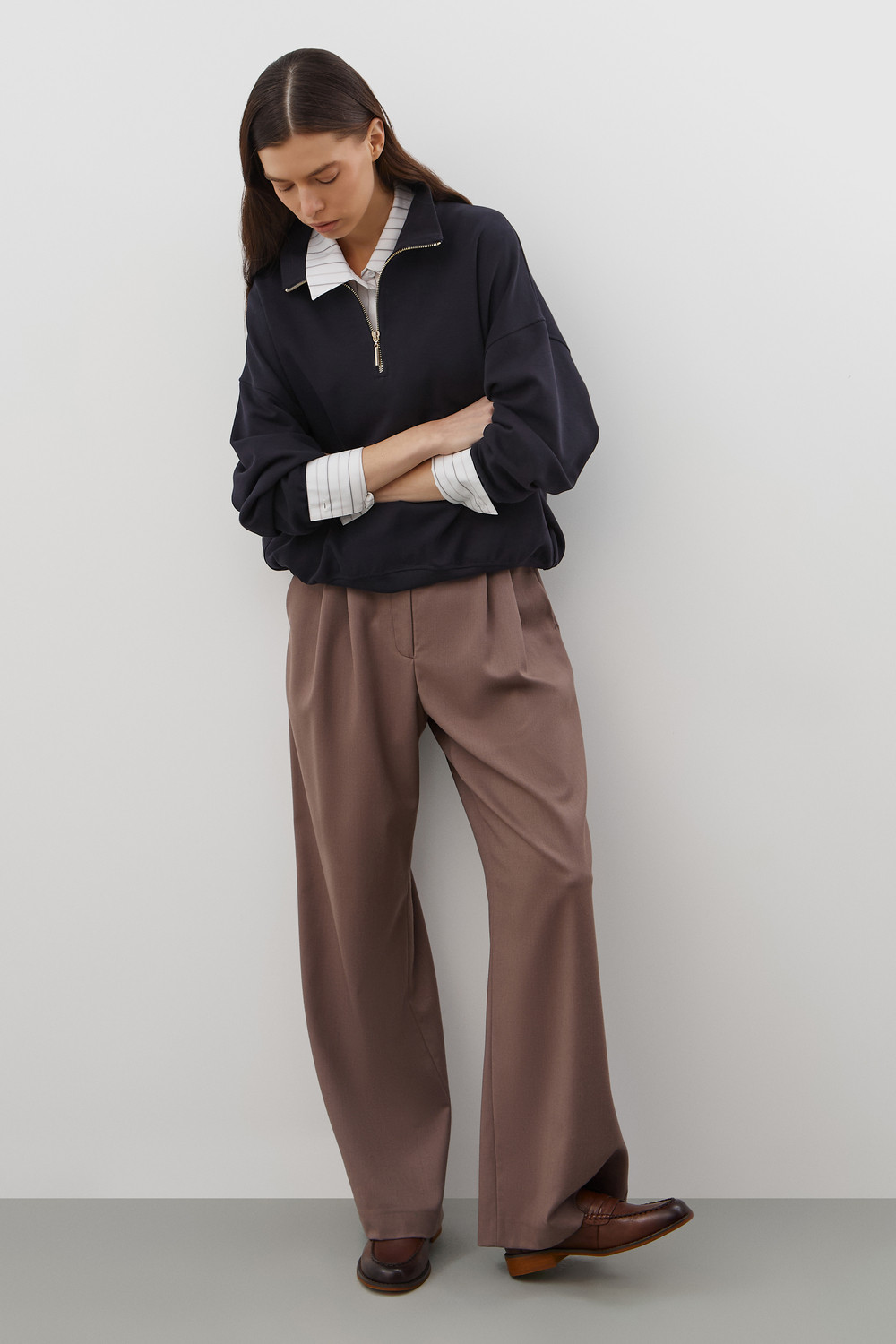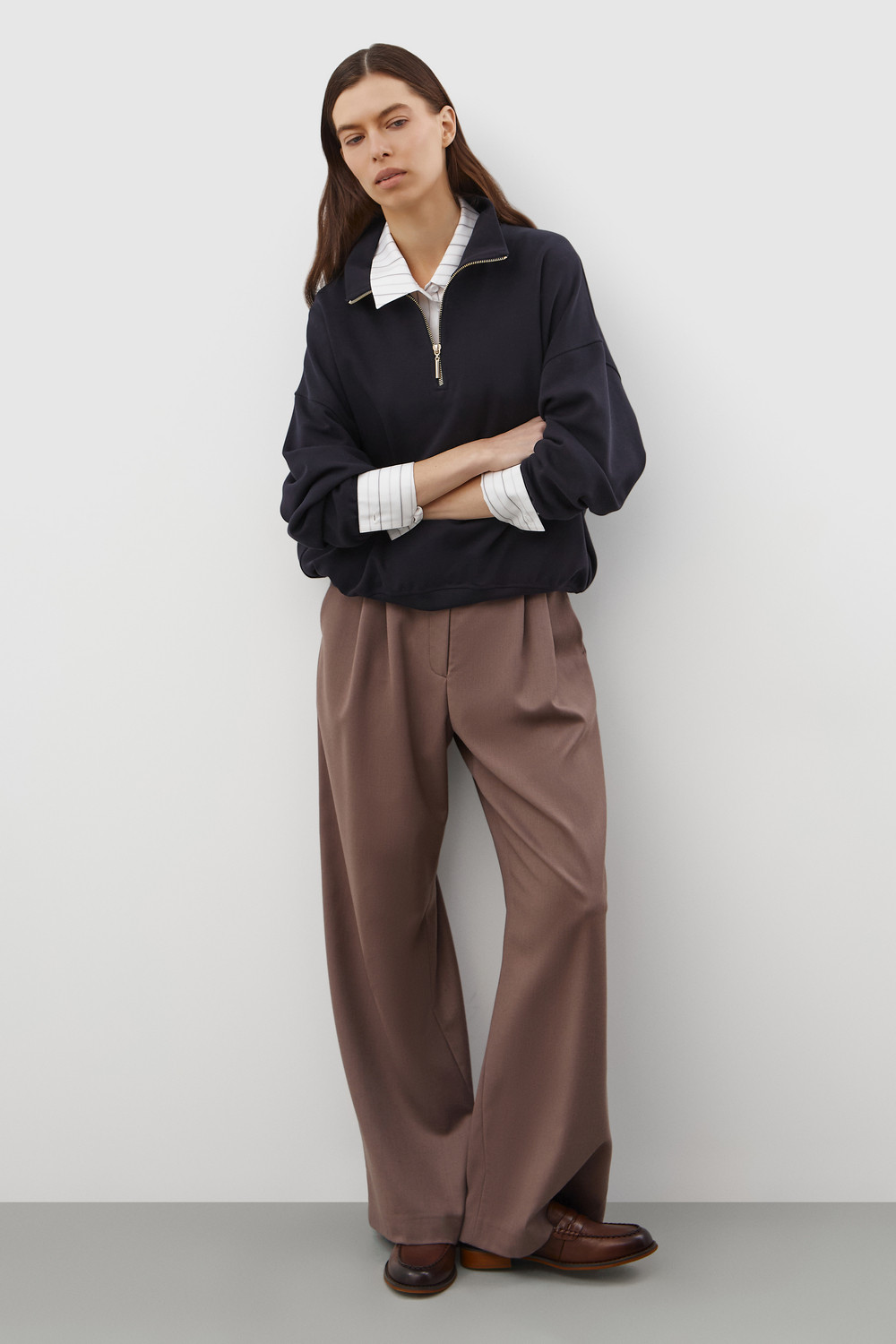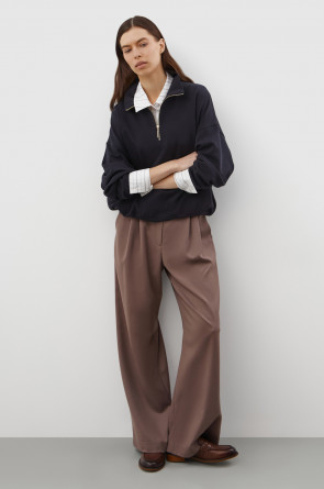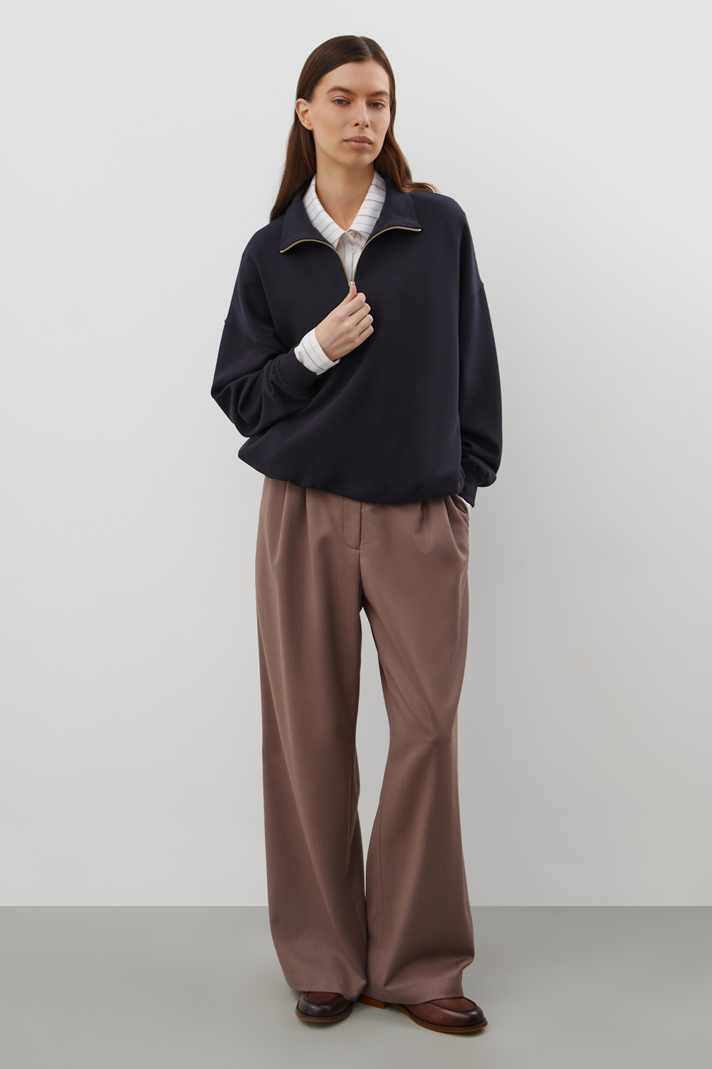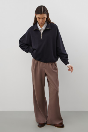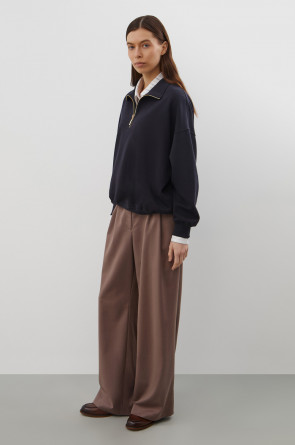 Джемпер с воротником на молнии является лаконичной базой. Комфортный тандем спущенной линии плеч и расслабленного кроя становится стильным дополнением различным образам.
