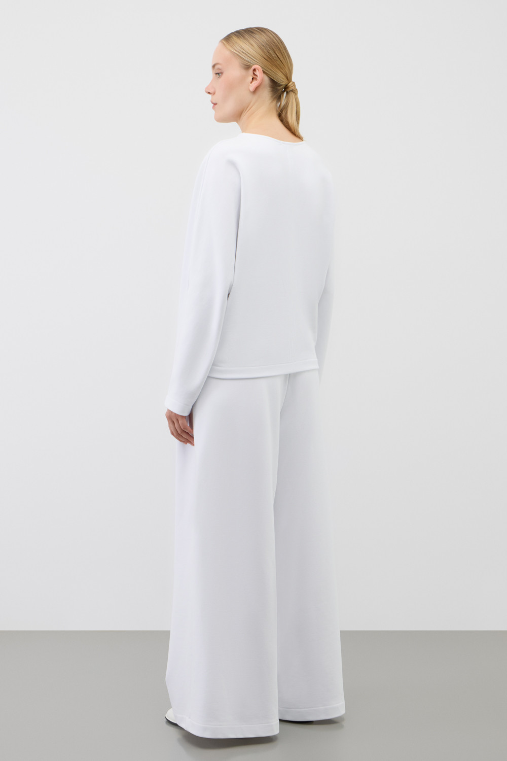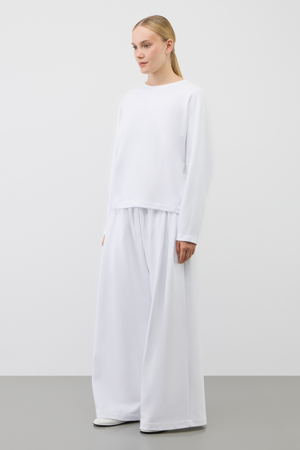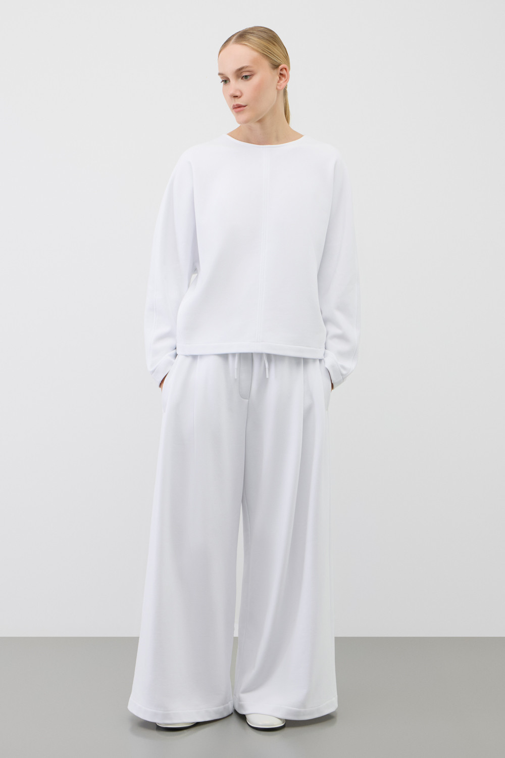 Стильный джемпер из хлопкового футера объемного силуэта. Изделие дополняет отделочный вертикальный шов по центру.