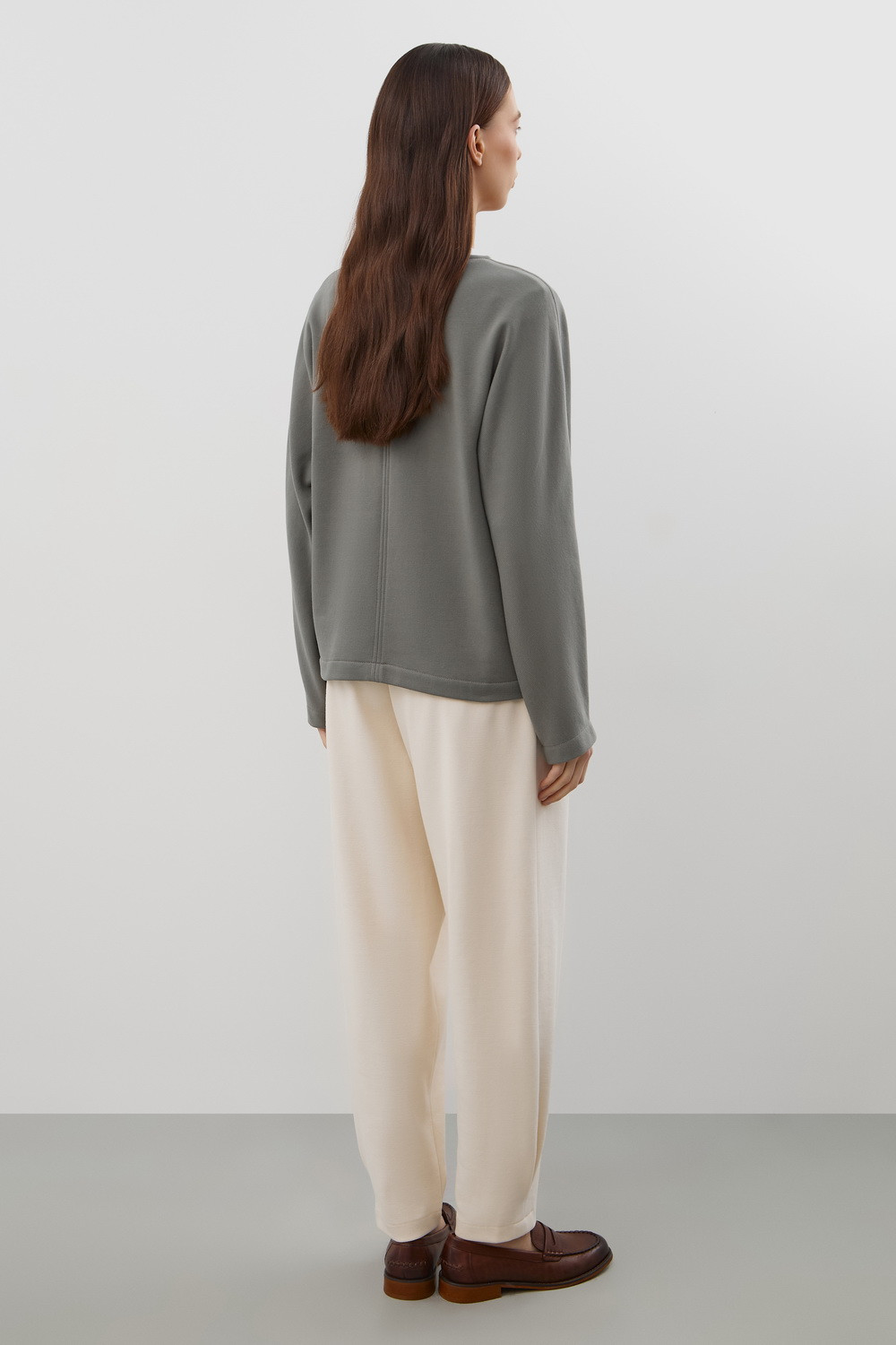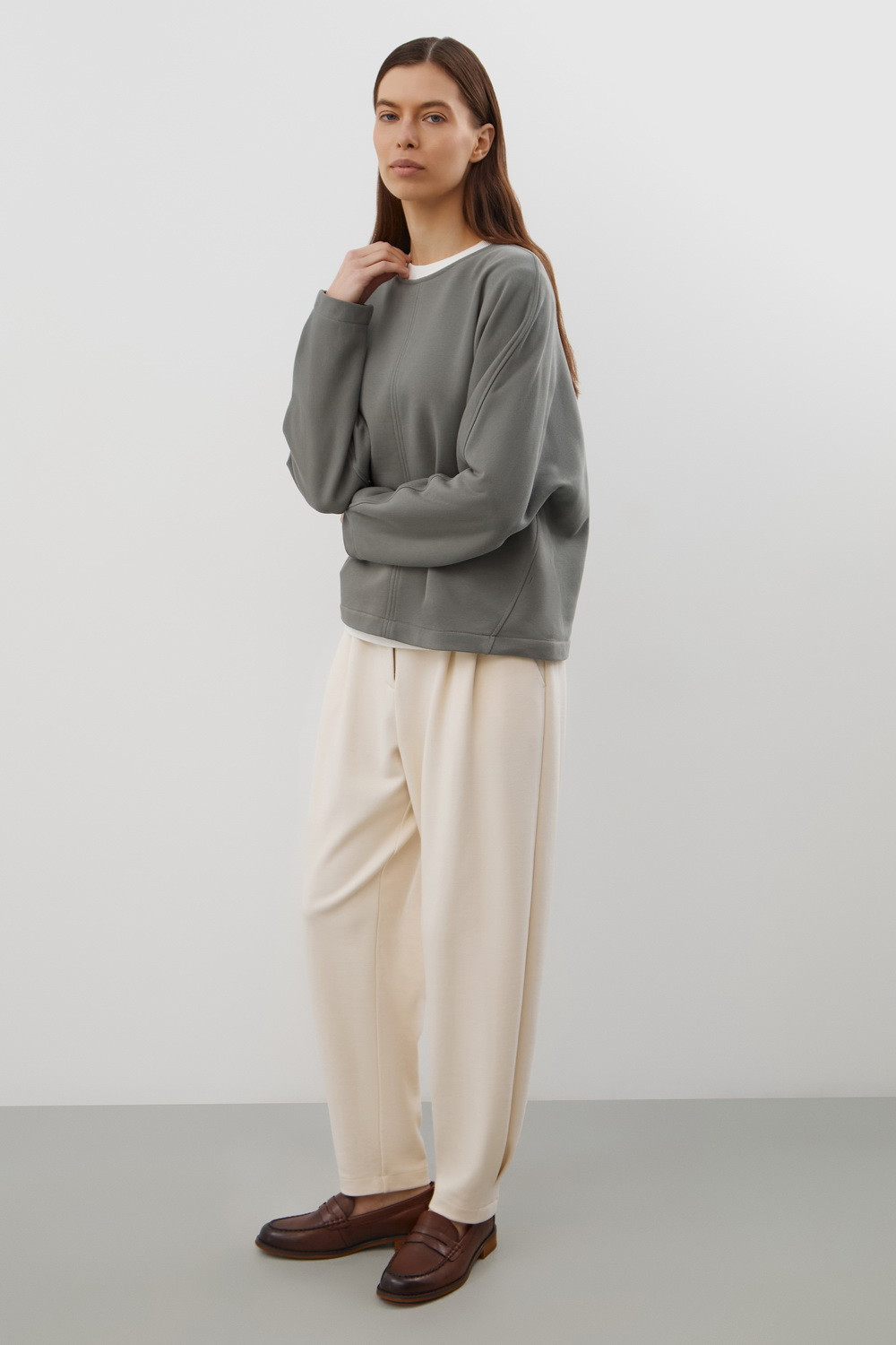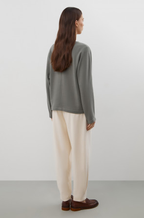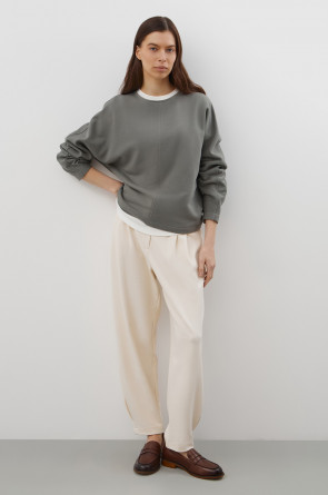 Стильный джемпер из хлопкового футера объемного силуэта. Изделие дополняет отделочный вертикальный шов по центру.