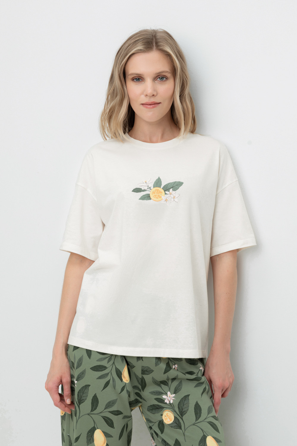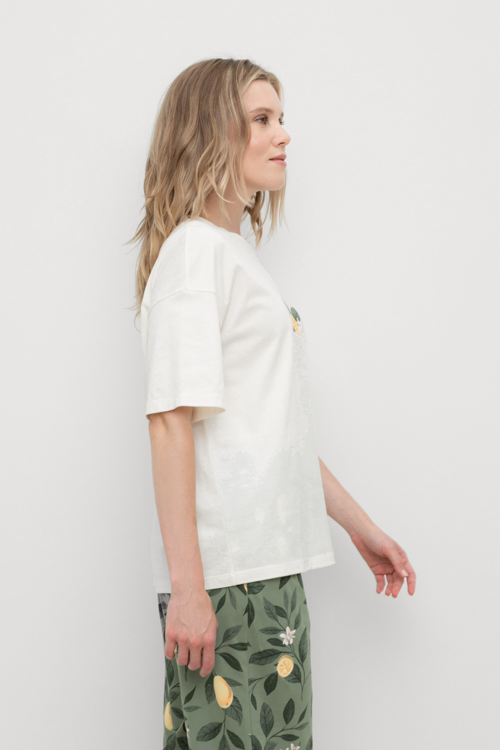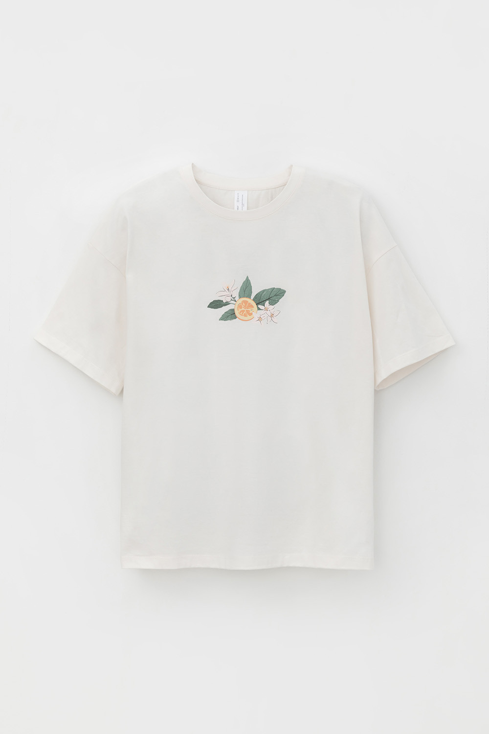 Удлиненная футболка из 100% натурального хлопка. Свободные рукава со спущенной линией плеча создают объём и свободный силуэт. Принт изготовлен из стойких текстильных красителей.