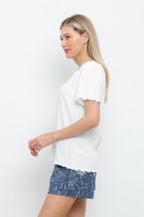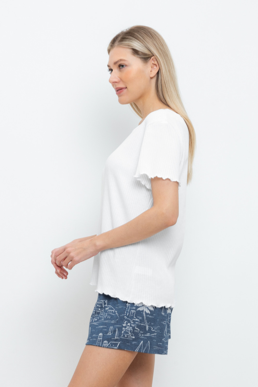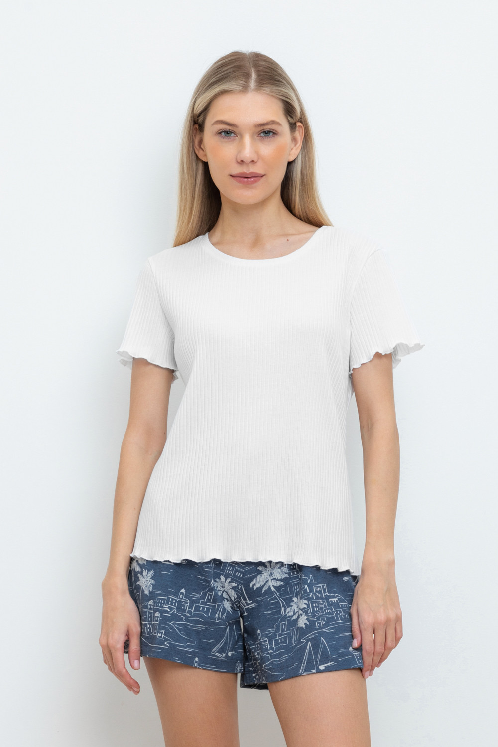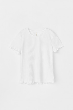 Комфортная футболка из трикотажного полотна в рубчик. Рукава и низ изделия обработаны микрооверлоком.