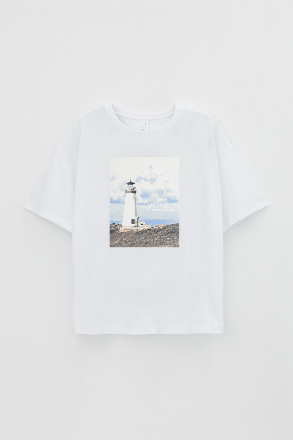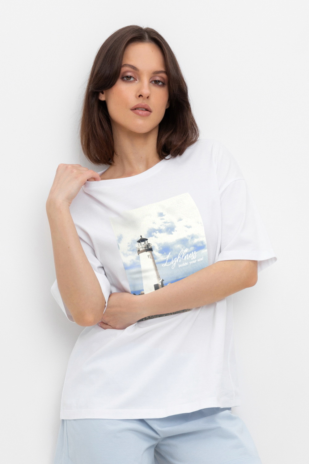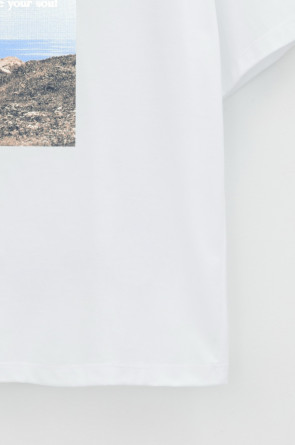 Удлиненная футболка из 100% натурального хлопка. Свободные рукава со спущенной линией плеча создают объём и свободный силуэт. Принт изготовлен из стойких текстильных красителей.