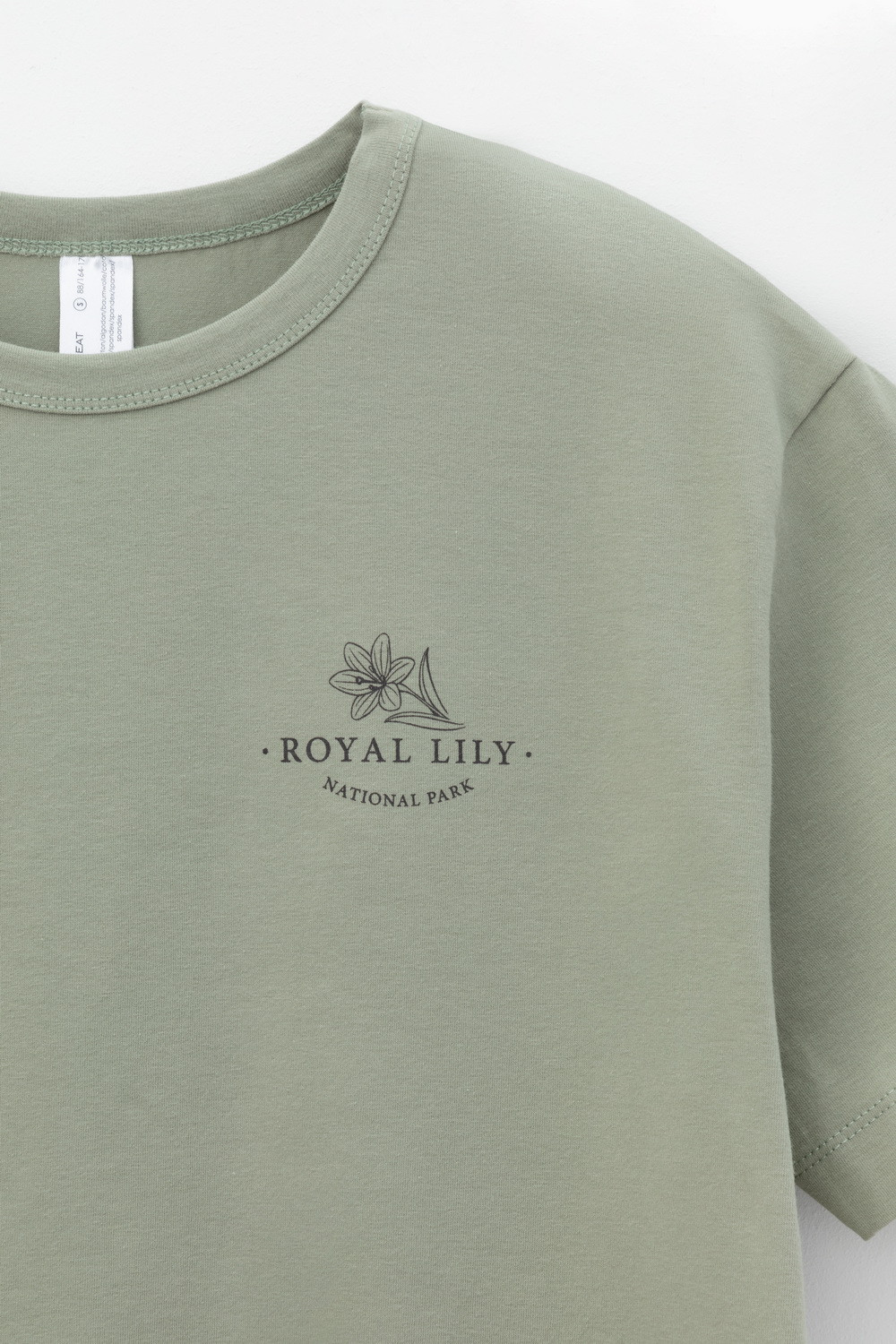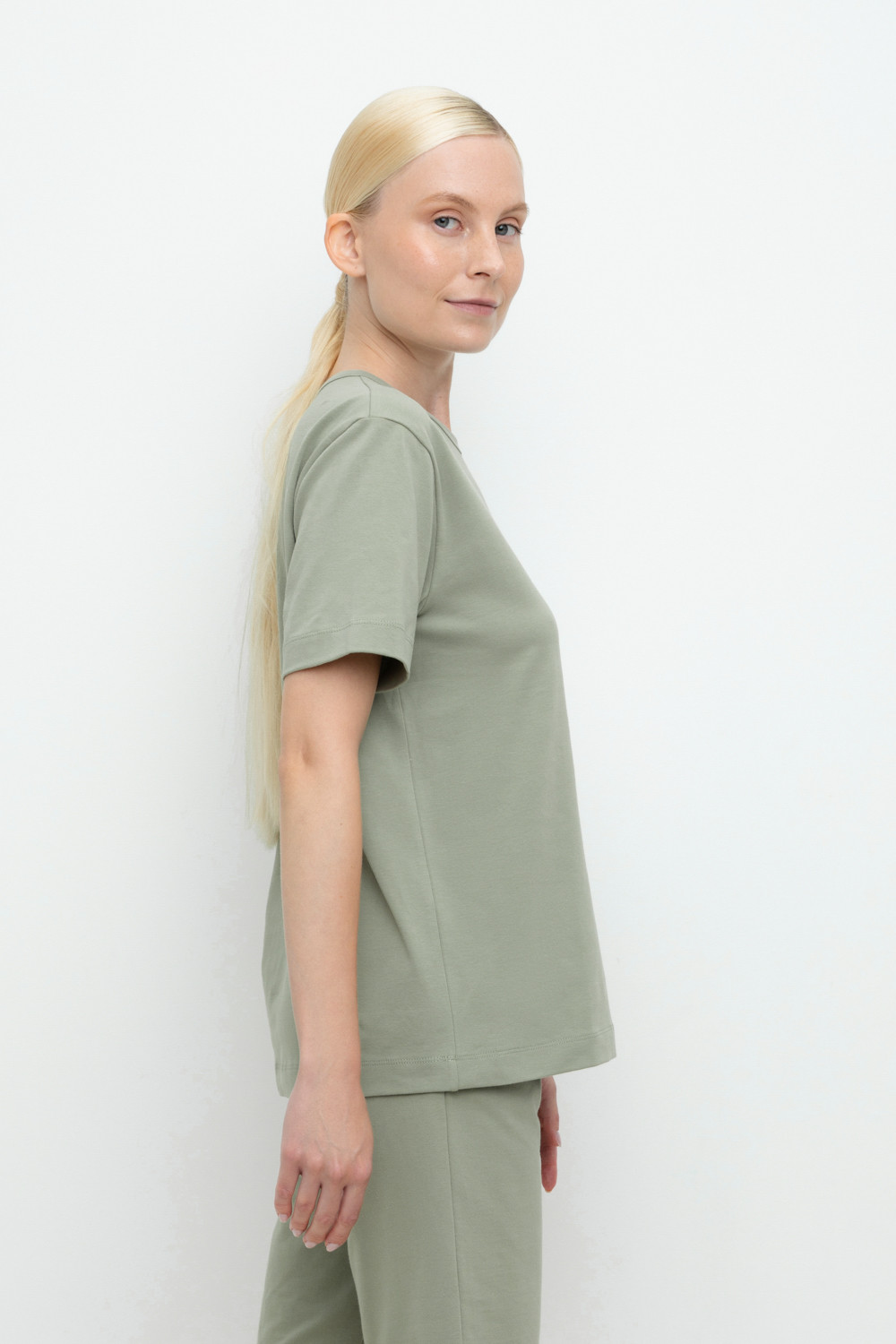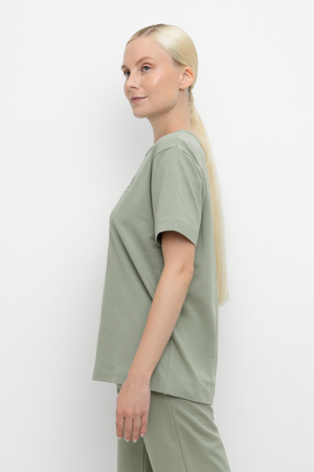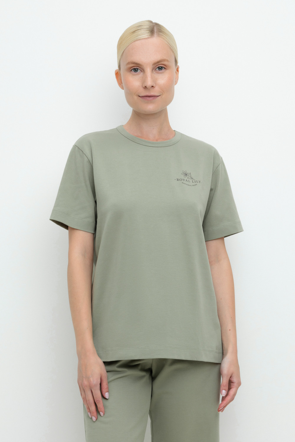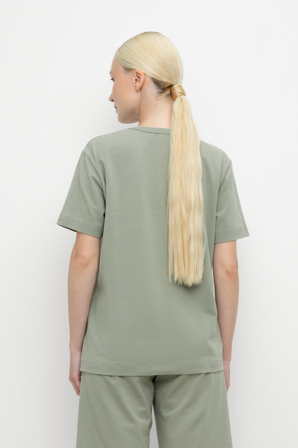 Базовая женская футболка из натурального хлопка с добавлением эластана. Принт изготовлен из стойких текстильных красителей.
