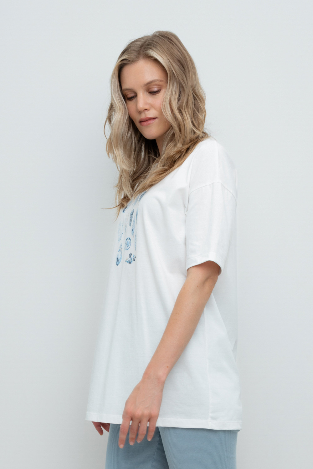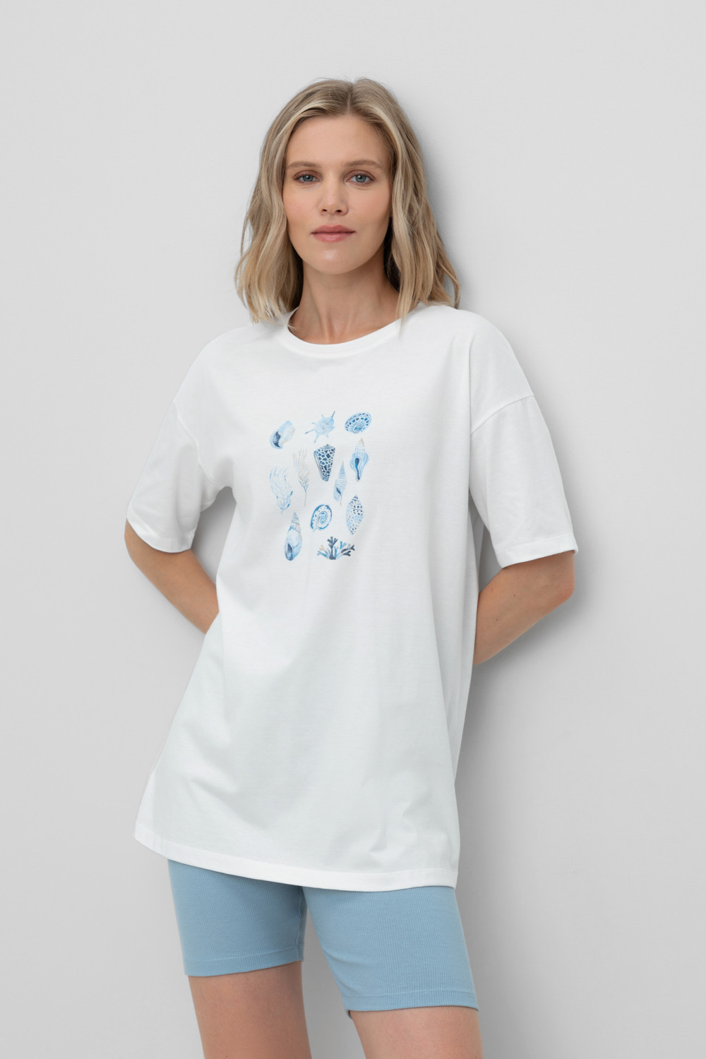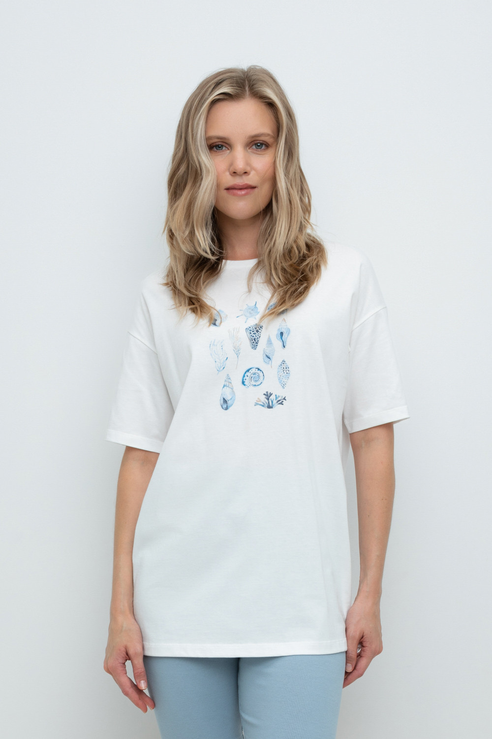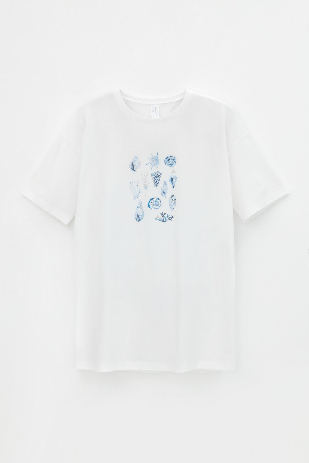 Удлиненная футболка из 100% натурального хлопка. Свободные рукава со спущенной линией плеча создают объём и свободный силуэт. Принт изготовлен из стойких текстильных красителей.