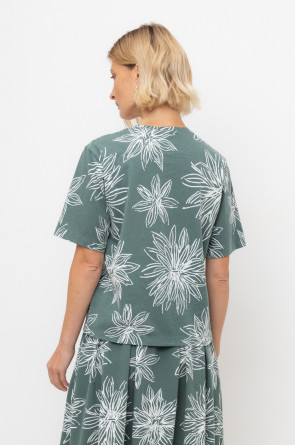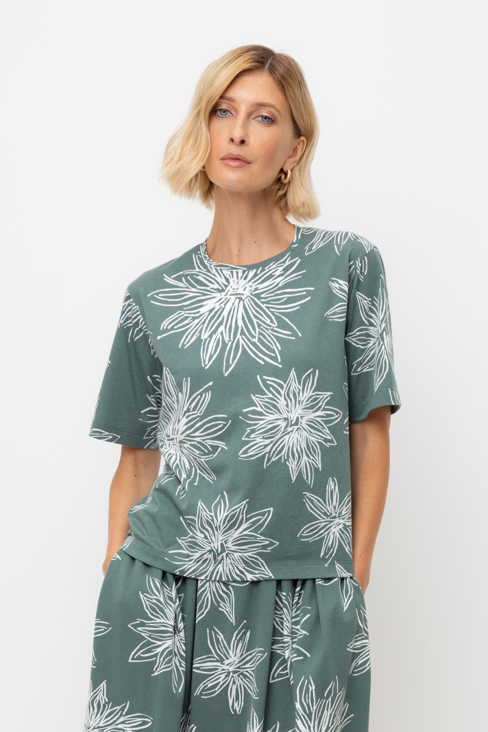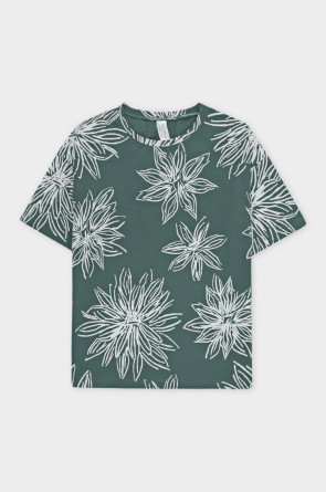 Свободная футболка из набивного пике из длинноволокнистого гребенного хлопка. Спущенное плечо придает изделию свободный силуэт.