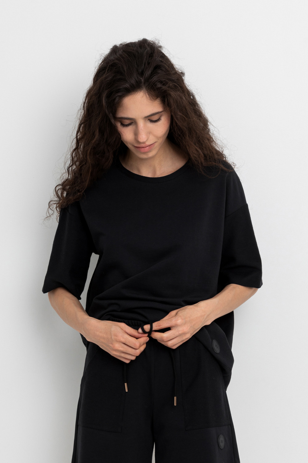 Удлиненная свободная футболка из мягкого футера с рукавами наизнанку.