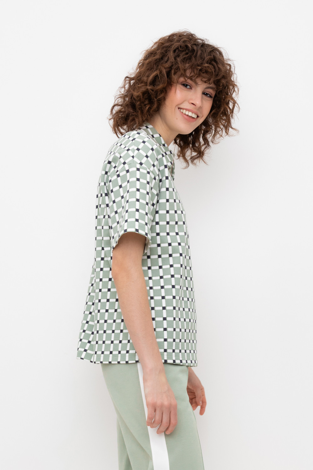 Джемпер поло с короткими рукавами и вязаным воротником из плотного набивного трикотажа интерлок с застежкой на молнию. Спущенное плечо придает изделию свободный силуэт.