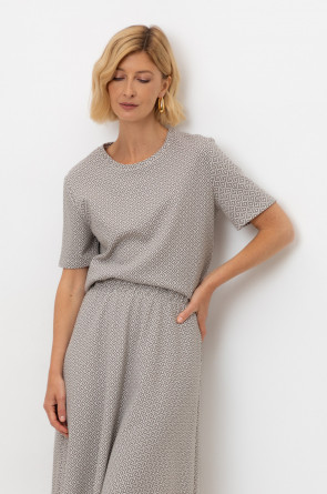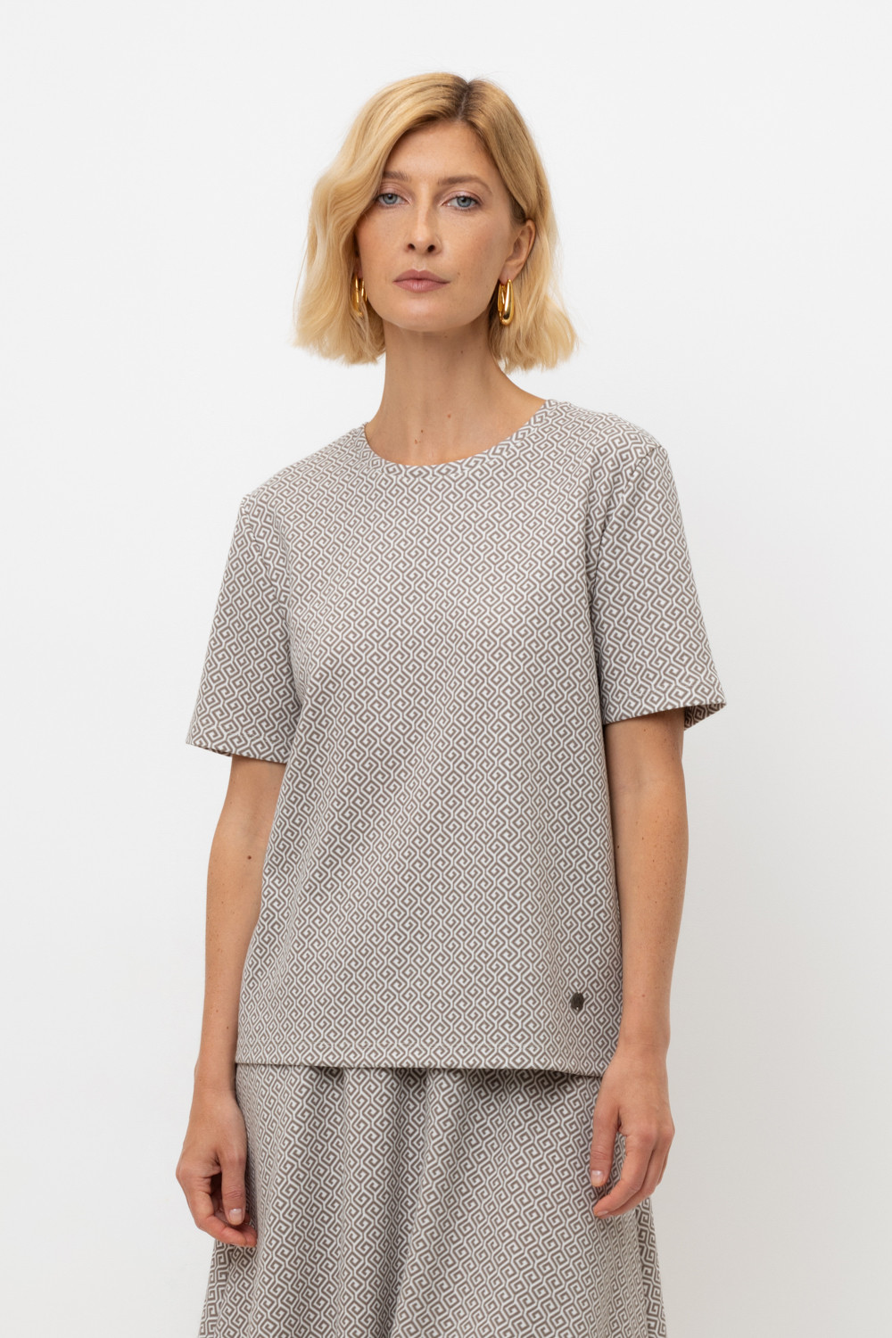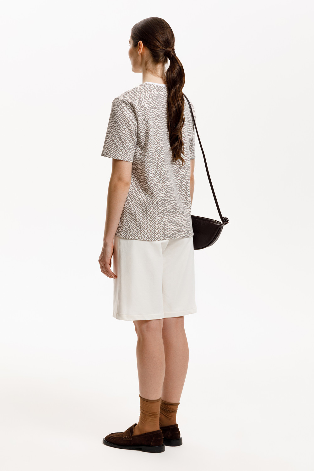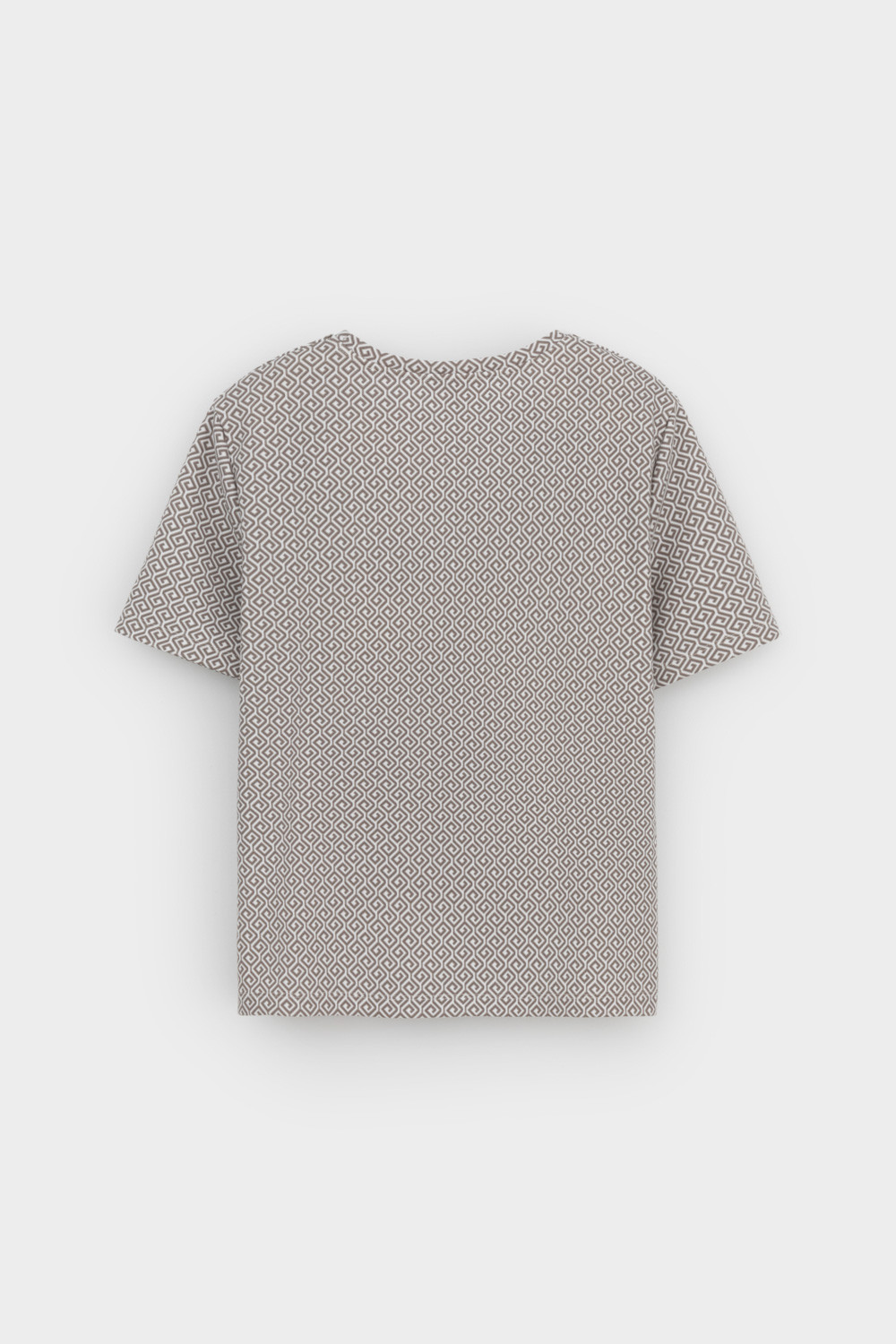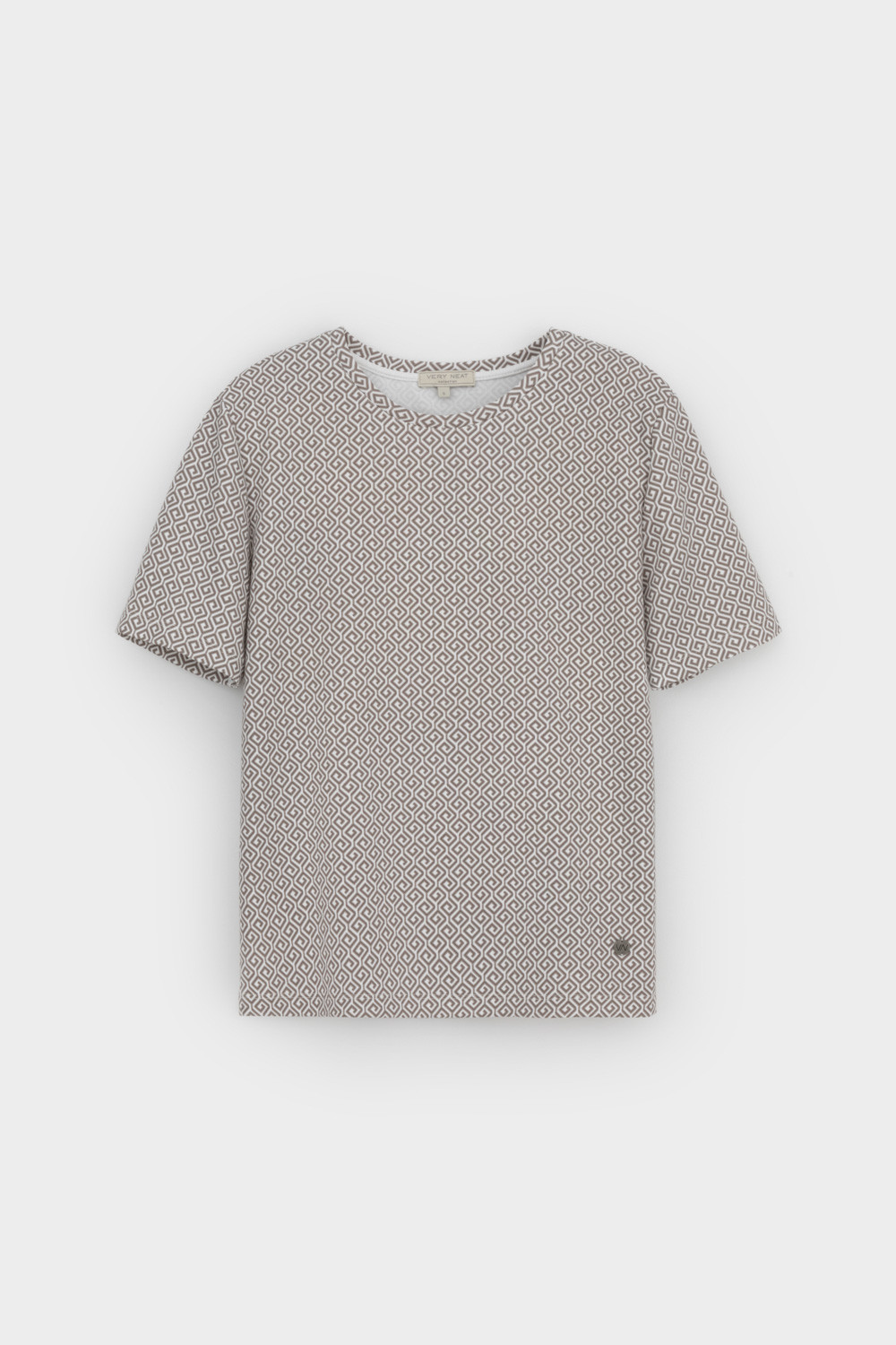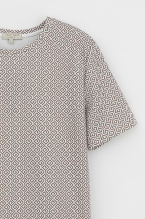 Футболка прямого силуэта, изготовленная из премиального трикотажного полотна DOUBLE FACE. Мягкий на ощупь трикотаж выполнен из высококачественной гребенной пряжи, а его графичный дизайн добавляет летнего настроения.