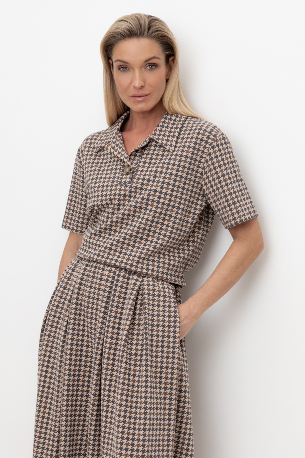 Джемпер поло с короткими рукавами из интерлока с V-образным вырезом и декоративной пуговицей.