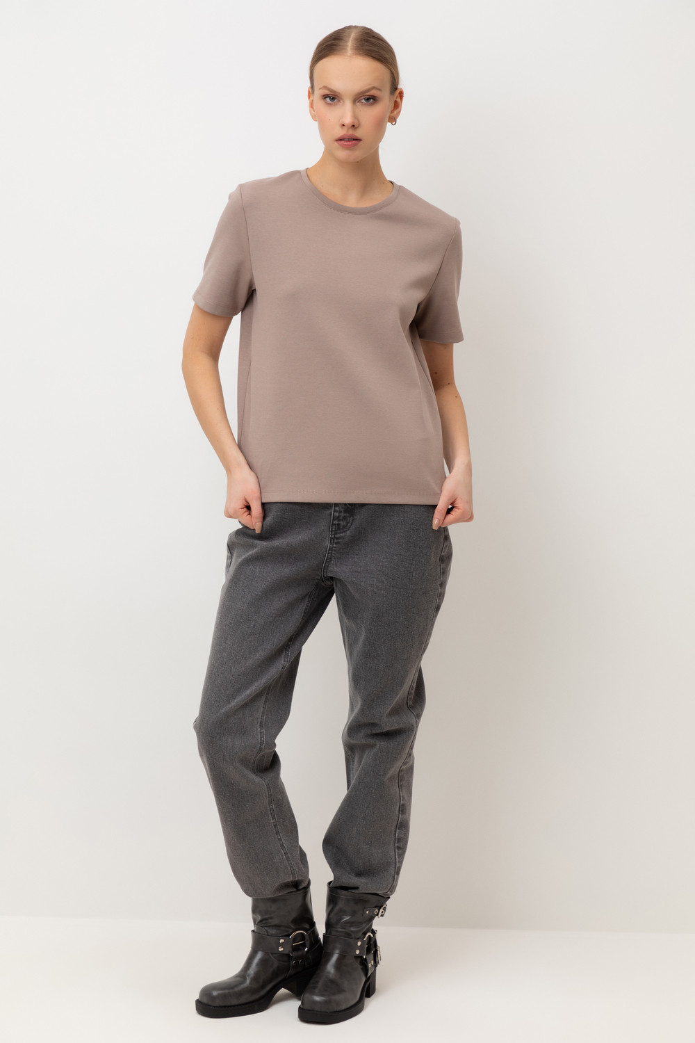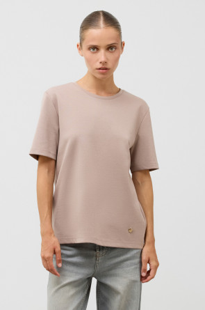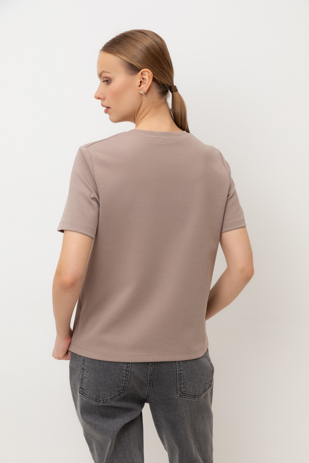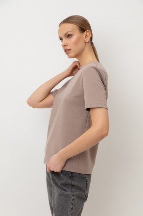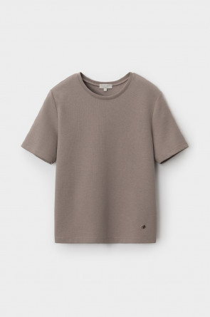 Базовая футболка из премиального трикотажа DOUBLE FACE. Трикотаж прошел обработку силиконом, что придает ему легкость и шелковистость текстуры. Имеет классический круглый вырез и удобный прямой крой.