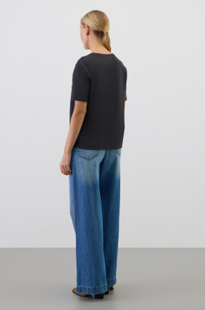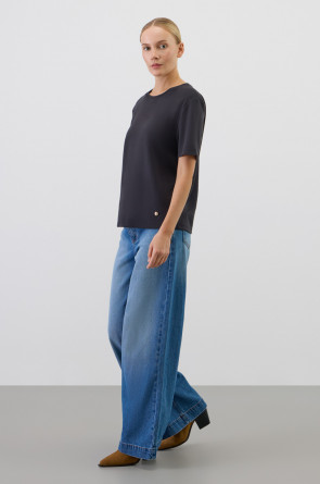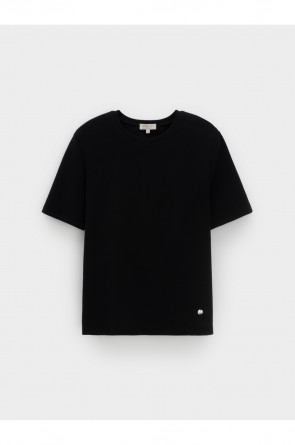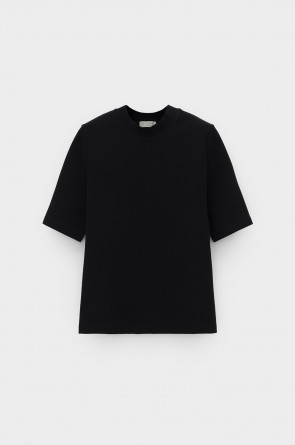 Базовая футболка из премиального трикотажа DOUBLE FACE. Трикотаж прошел специальную каучуковую обработку, что придает ему легкость и шелковистость текстуры. Имеет классический круглый вырез и удобный прямой крой.