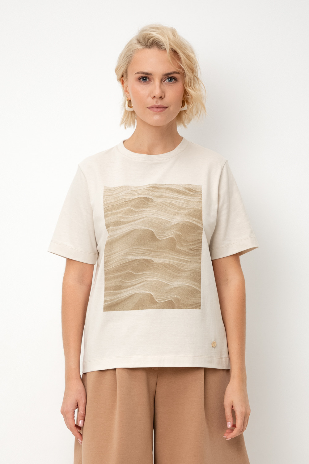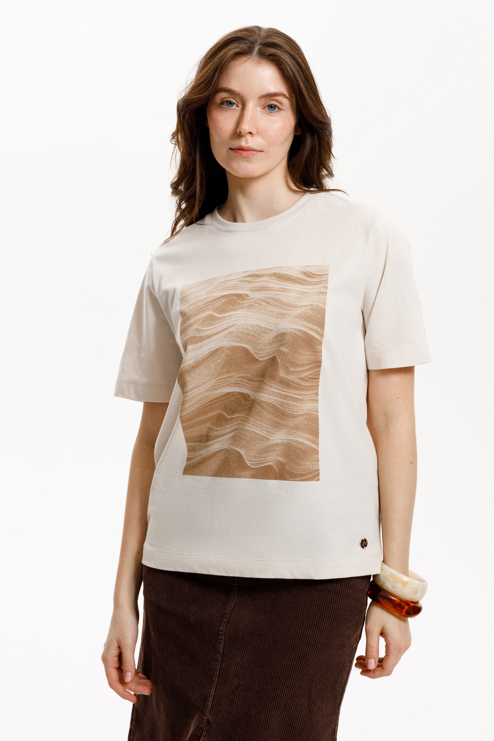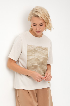 Футболка прямого силуэта из высококачественного гребенного хлопка. Мягкий на ощупь принт выполнен из водных красок, что обеспечивает устойчивость к многократным стиркам.