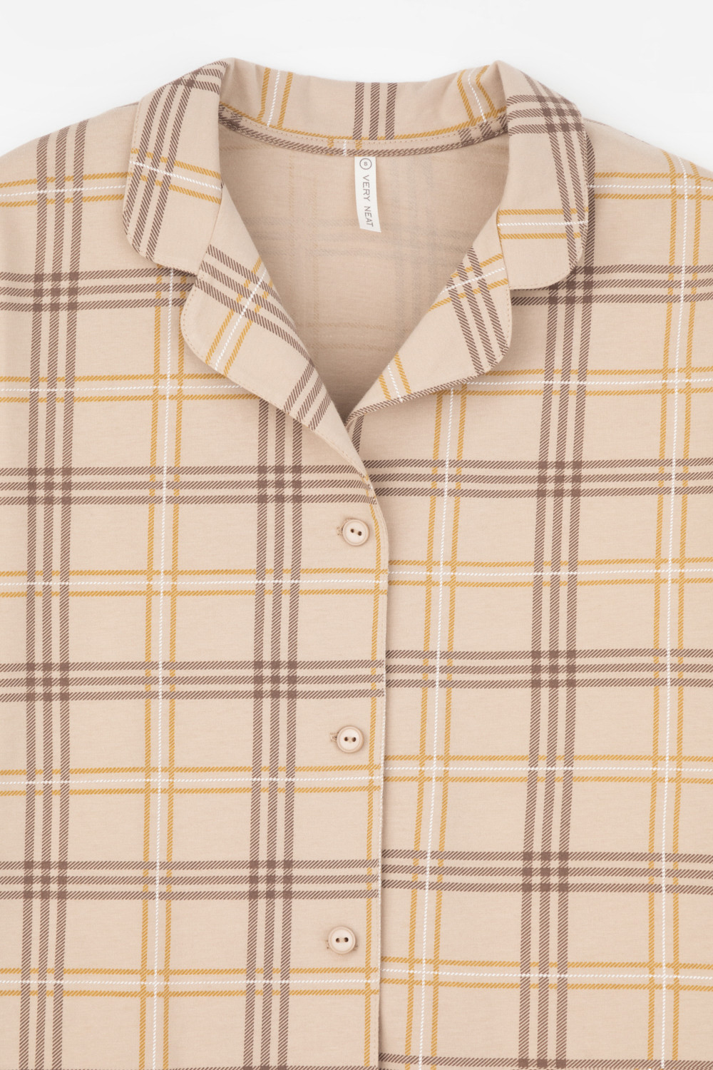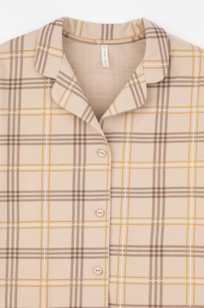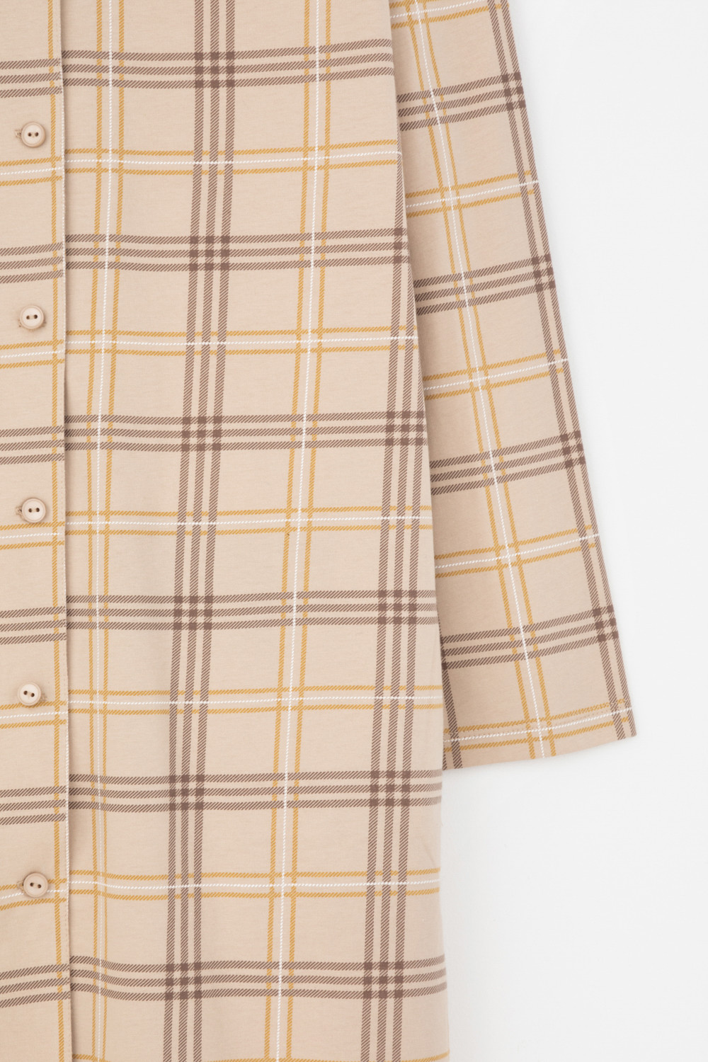 Рубашка-халат с длинными рукавами на пуговицах из набивного трикотажа. Гладкий материал приятен к телу и позволяет коже дышать.