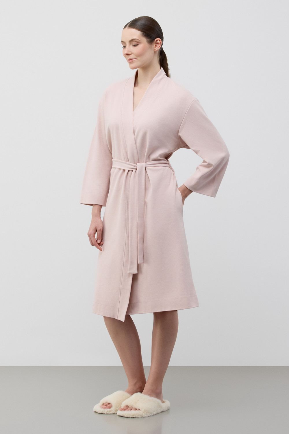 Халат из мягкого вафельного хлопка подарит атмосферу домашнего уюта и комфорта. Карманы добавляют изделию практичности.
