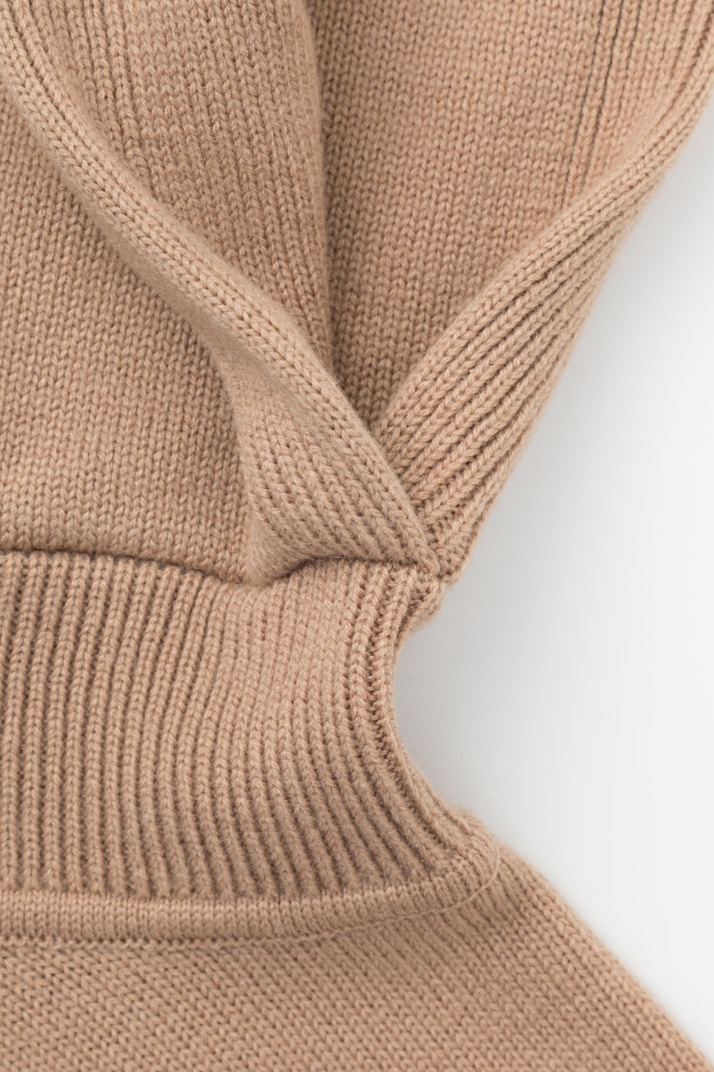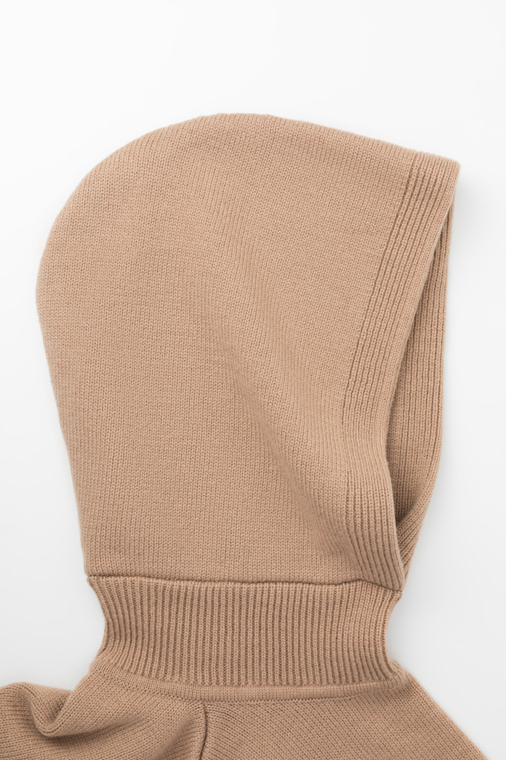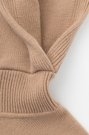 Теплый вязаный капор с глубоким капюшоном из шерсти и акрила. Шерсть в составе хорошо удерживает тепло, а волокна акрила делают изделие мягким и предотвращают деформацию и появление катышек. Лаконичный крой хорошо сочетается с верхней одеждой.