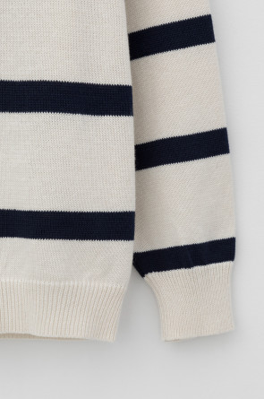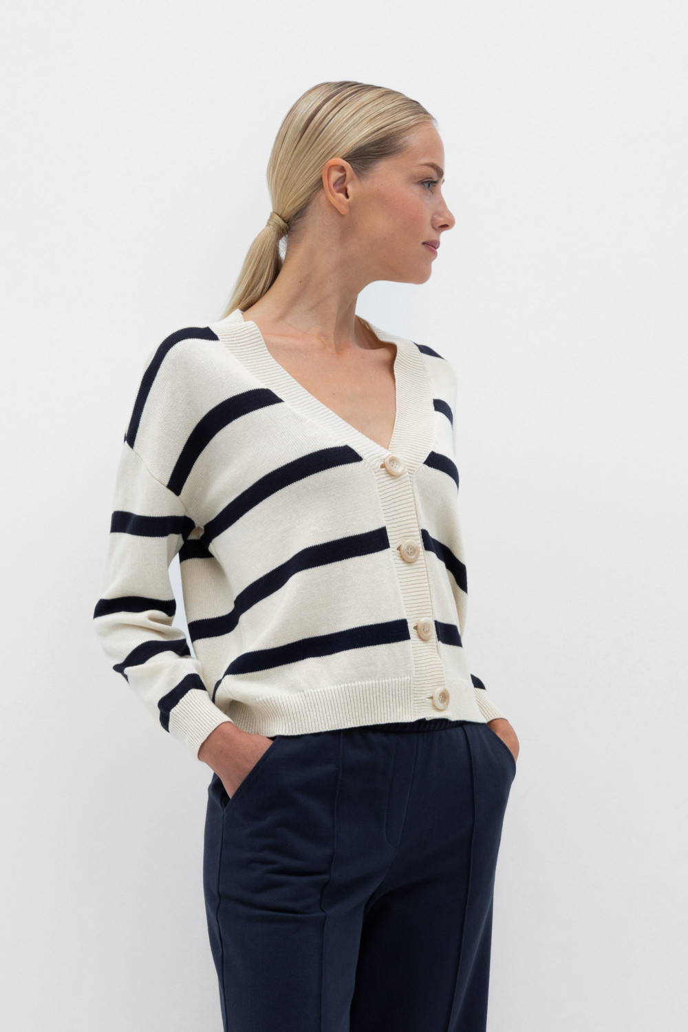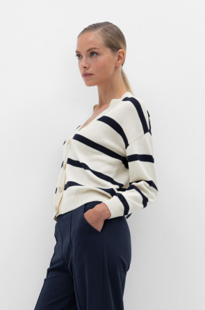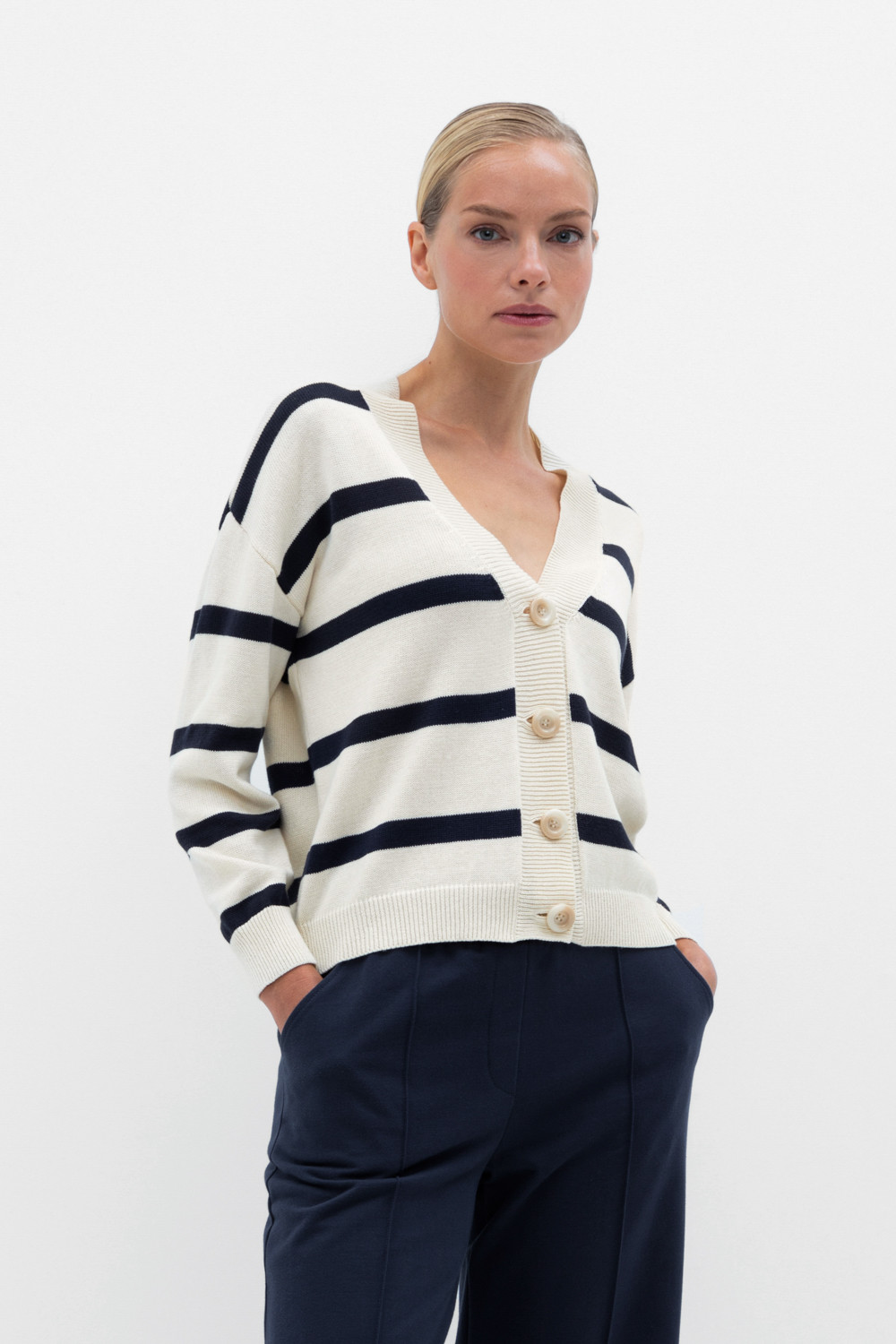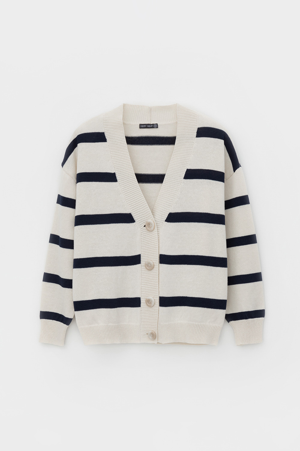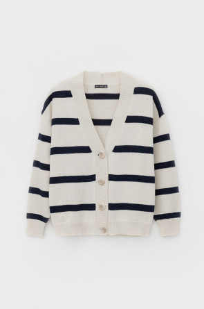 Вязаный кардиган в полоску на пуговицах из хлопка с добавлением акрила. Фактурная вязка сохраняет форму, а манжеты и нижний край изделия не растянутся благодаря вывязанной резинке.