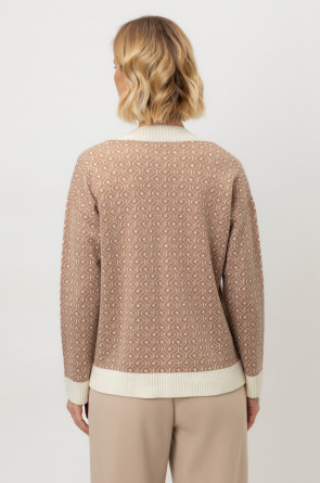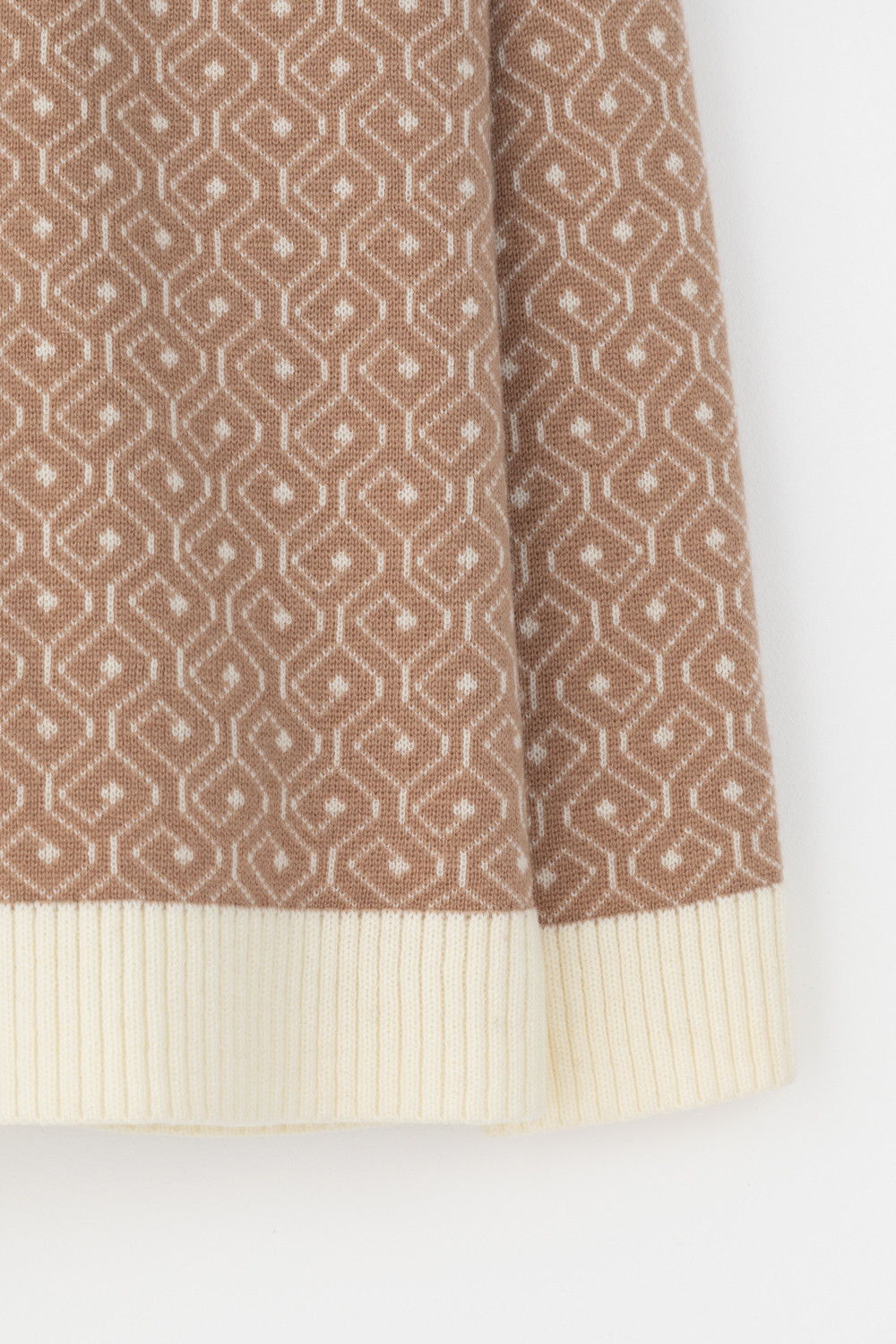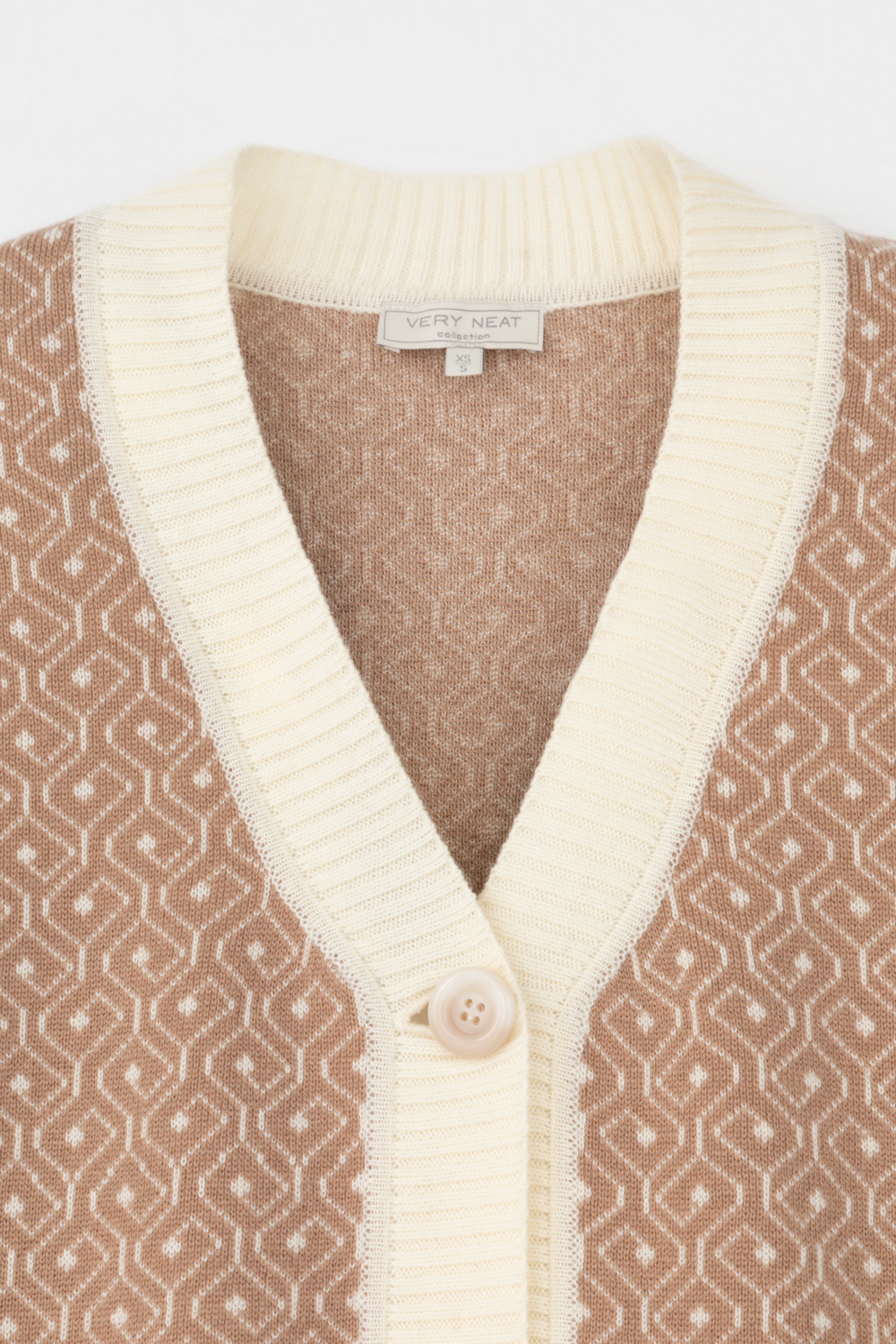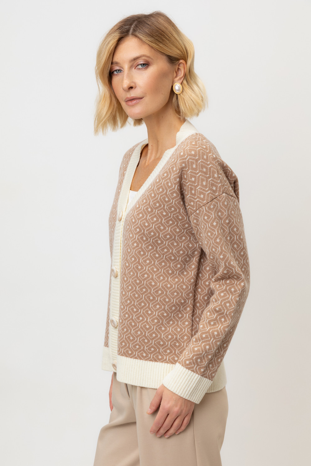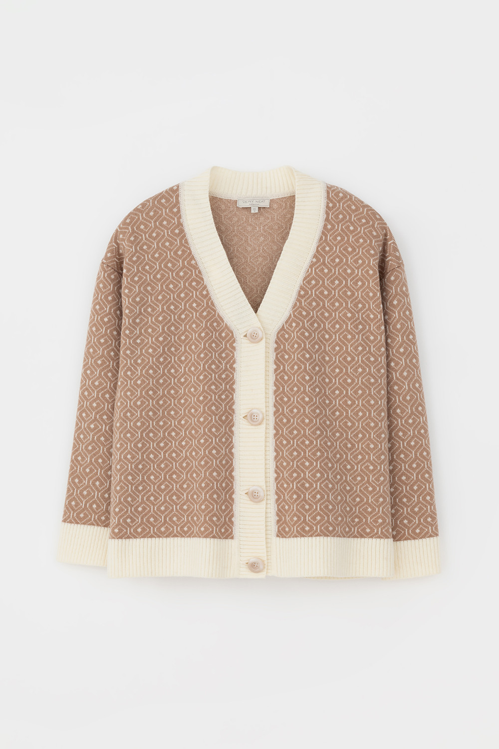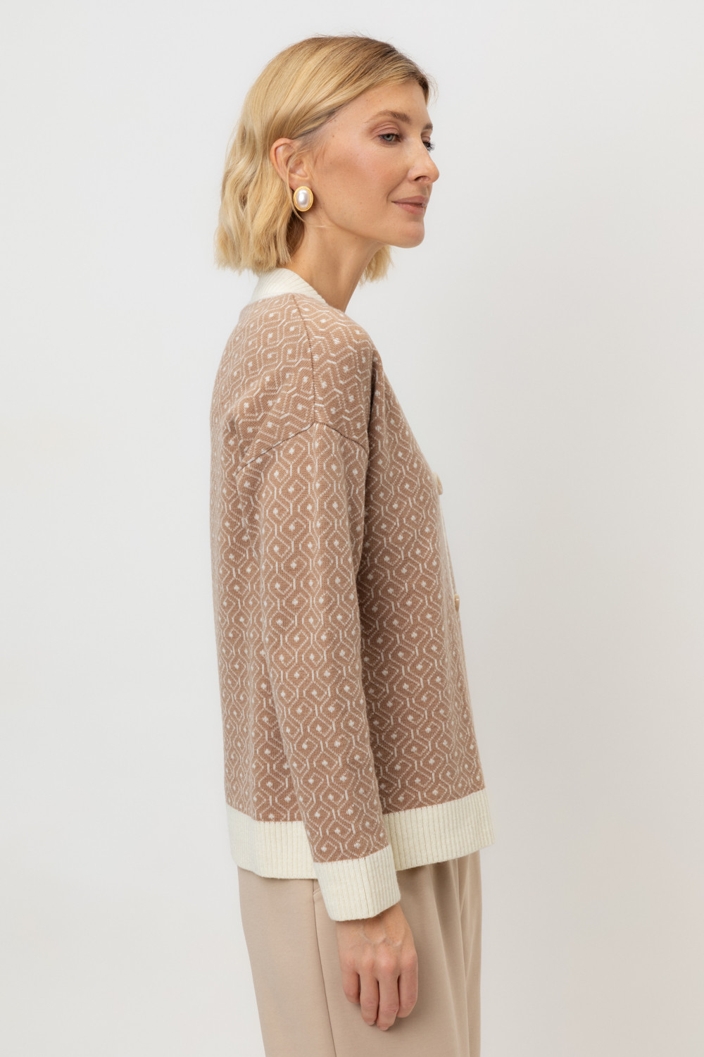 Вязаный кардиган на пуговицах из шерсти с добавлением акрила. Связан жаккардом, а манжеты и нижний край не растянутся благодаря вывязанной резинке. Шерсть мериноса в составе сохраняет тепло, акрил делает изделие мягким. Прямой силуэт идеально подходит как к юбке, так и к брюкам.