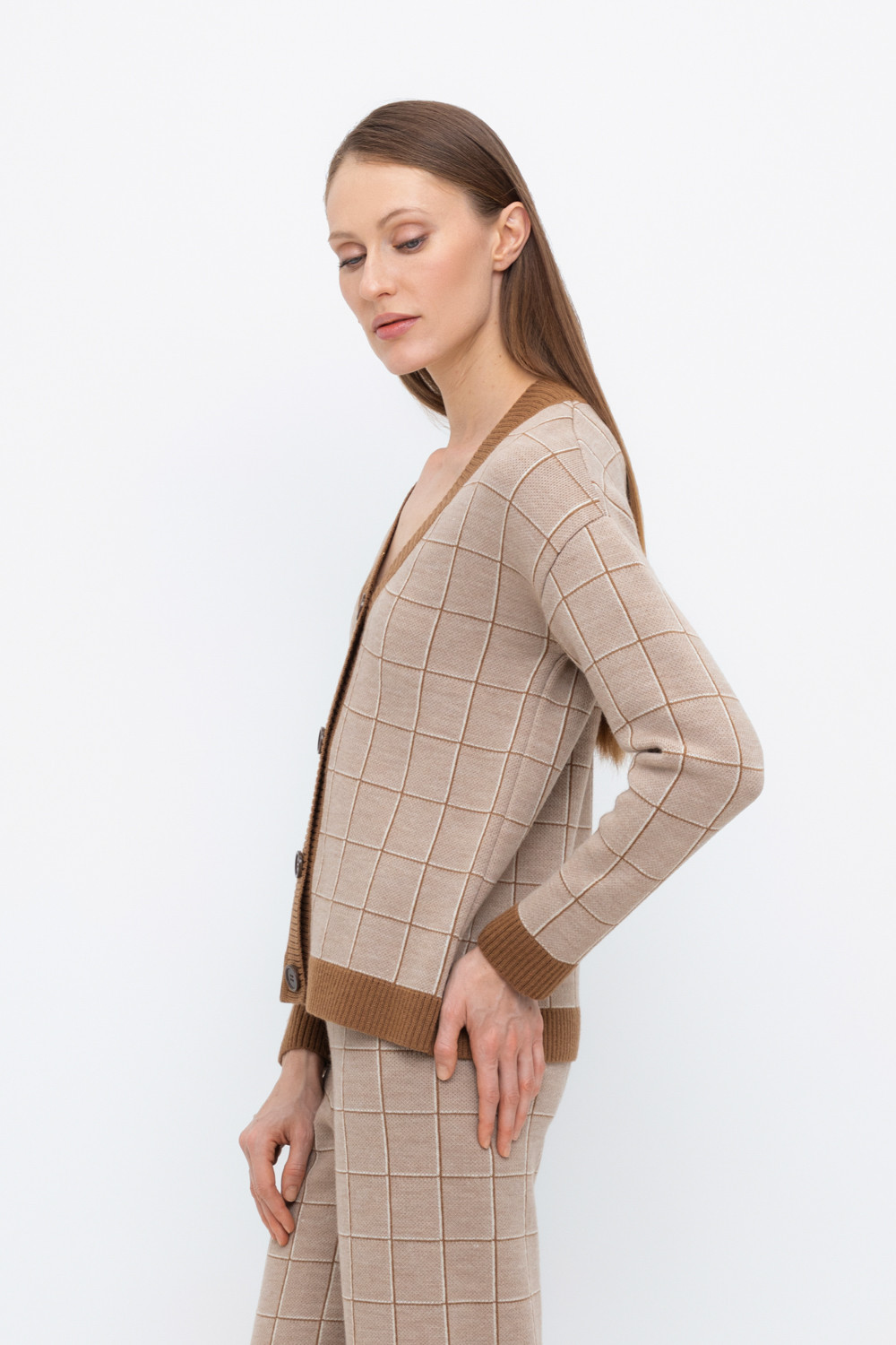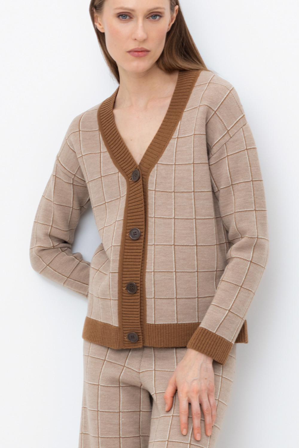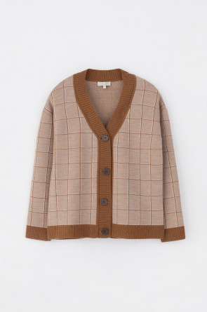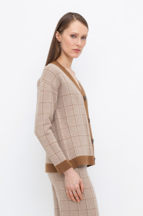Вязаный кардиган на пуговицах из шерсти с добавлением акрила. Связан жаккардом, а манжеты и нижний край не растянутся благодаря вывязанной резинке.