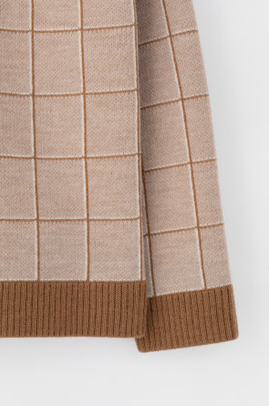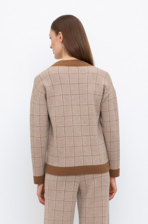 Выполнен из мягкой полушерстяной пряжи. Шерсть мериноса в составе сохраняет тепло, акрил делает изделие мягким. Прямой силуэт идеально подходит как к юбке, так и к брюкам.