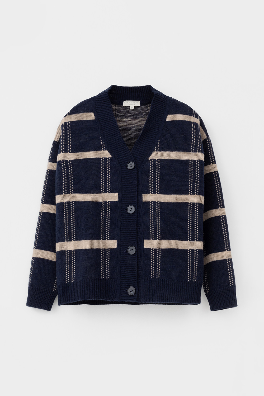 Вязаный кардиган на пуговицах из шерсти с добавлением акрила. Связан жаккардом, а манжеты и нижний край не растянутся благодаря вывязанной резинке.