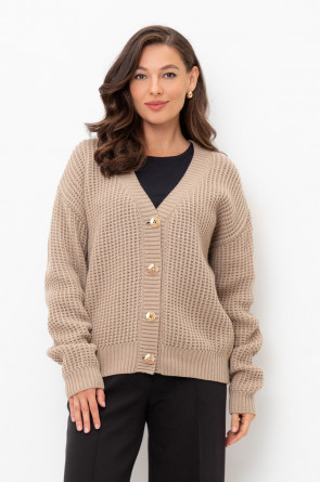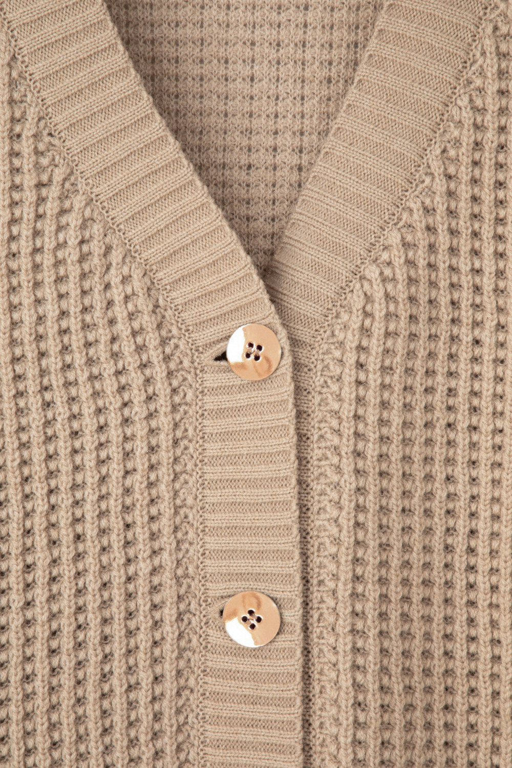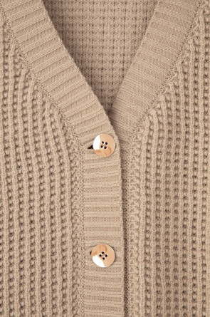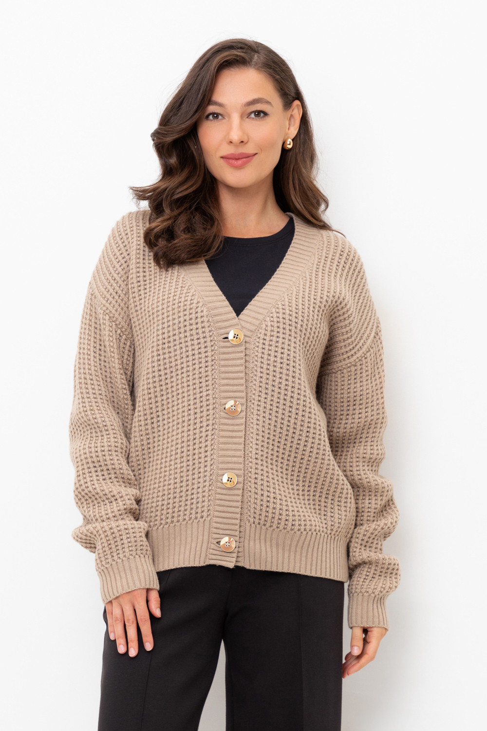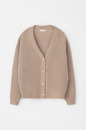 Вязаный кардиган на пуговицах из шерсти с добавлением акрила. Ажурная вязка, манжеты и нижний край не растянутся благодаря вывязанной резинке.