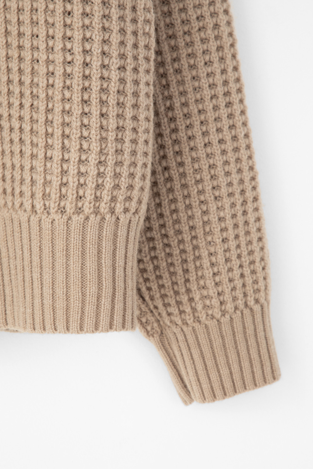 Выполнен из мягкой полушерстяной пряжи. Шерсть мериноса в составе сохраняет тепло, акрил делает изделие мягким. Прямой силуэт идеально подходит как к юбке, так и к брюкам.