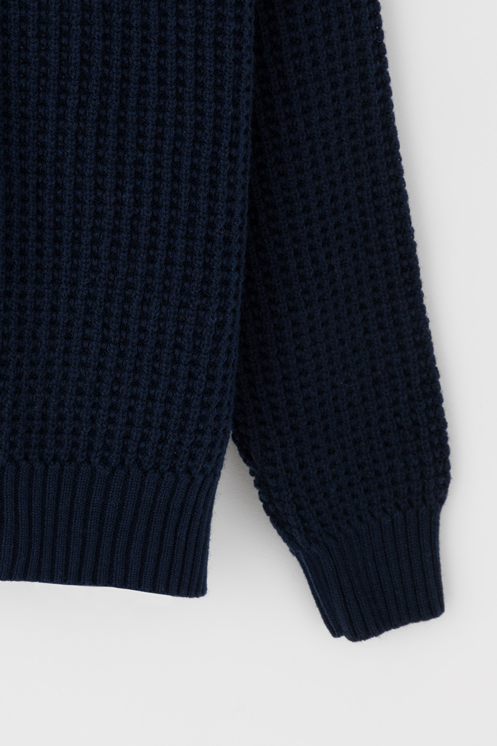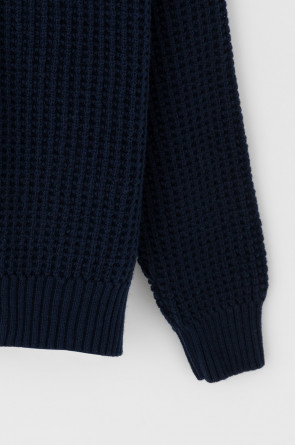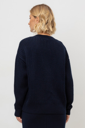 Выполнен из мягкой полушерстяной пряжи. Шерсть мериноса в составе сохраняет тепло, акрил делает изделие мягким. Прямой силуэт идеально подходит как к юбке, так и к брюкам.