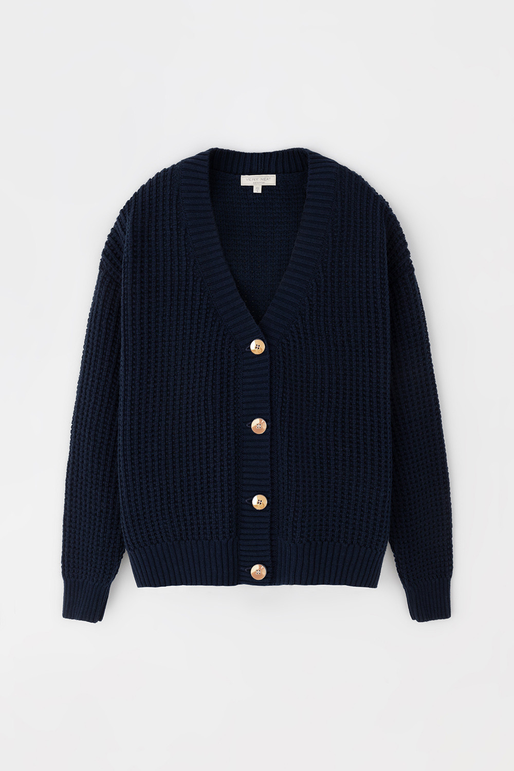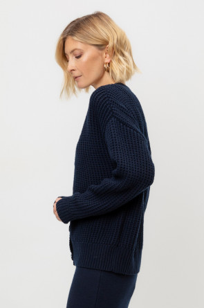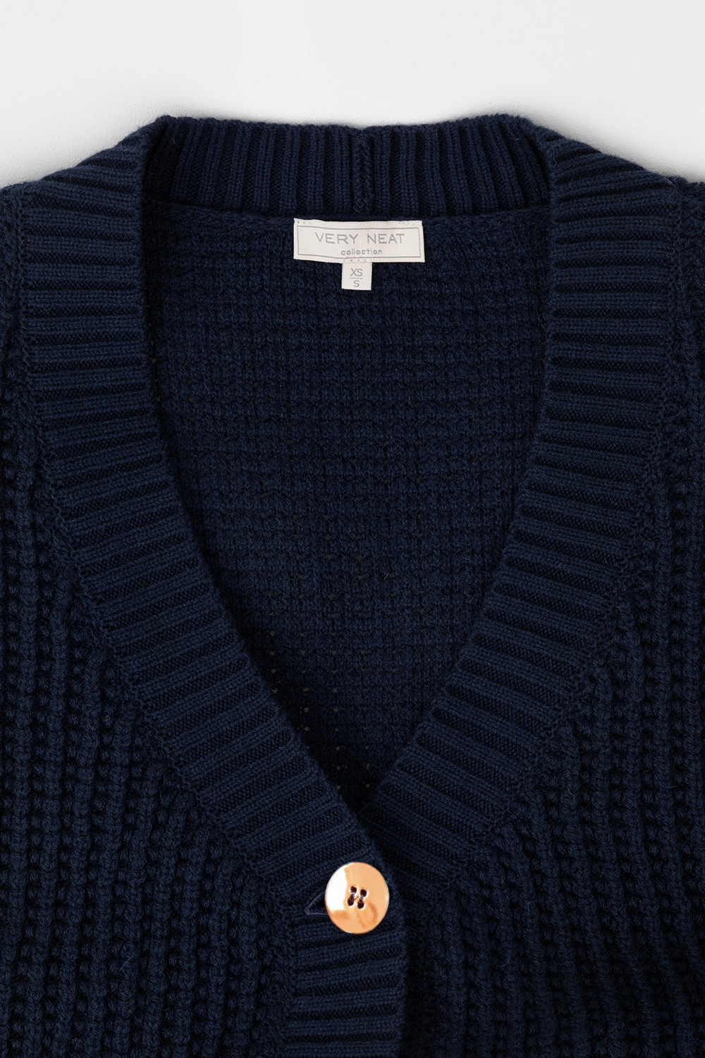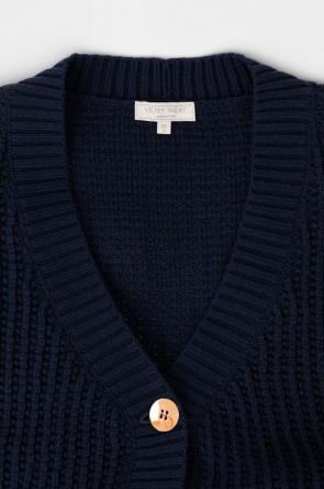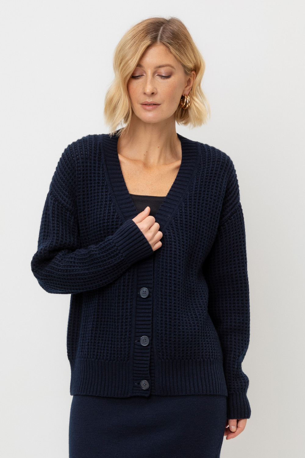 Вязаный кардиган на пуговицах из шерсти с добавлением акрила. Ажурная вязка, манжеты и нижний край не растянутся благодаря вывязанной резинке.