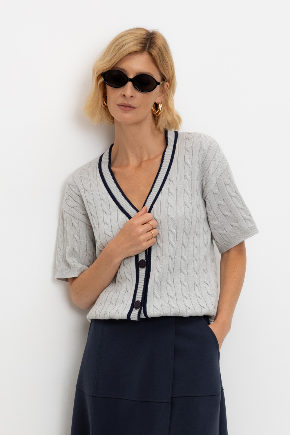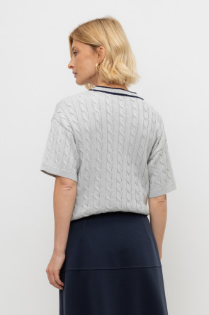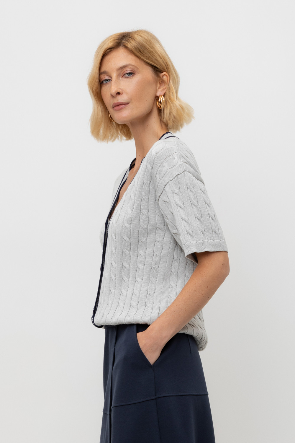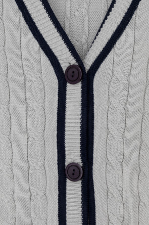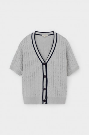Итальянская хлопковая пряжа жемчужно-серого цвета стала основой для мягкого кардигана. Переплетение в стиле кос, контрастная отделка планки и цвет пуговиц придают изделию классический вид. Хлопок в составе сохраняет форму и дарит ощущение комфорта во время носки.
