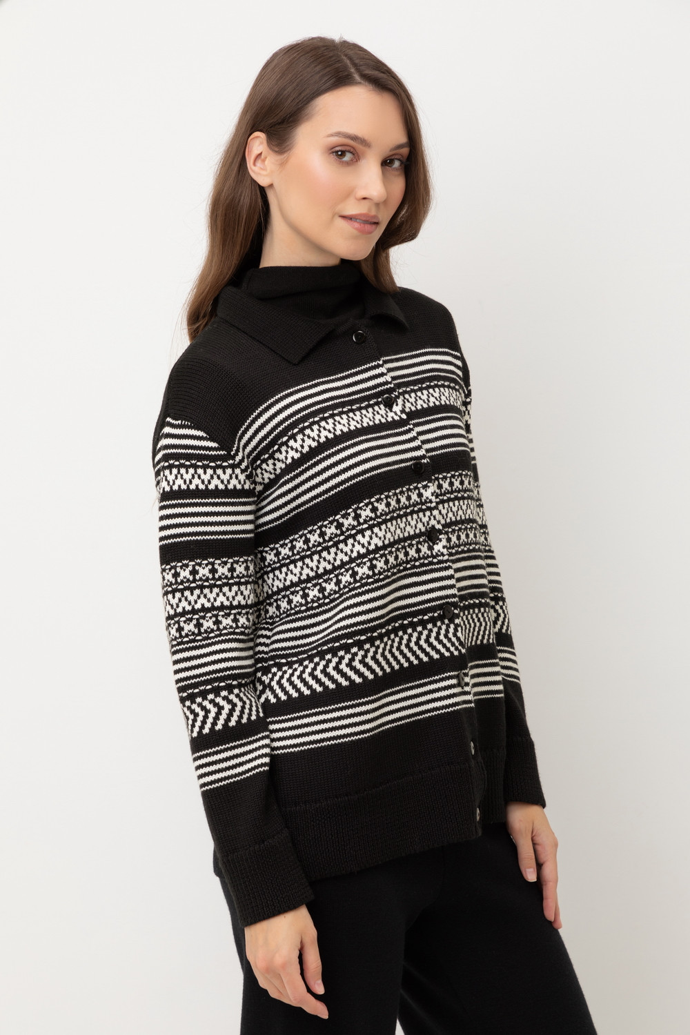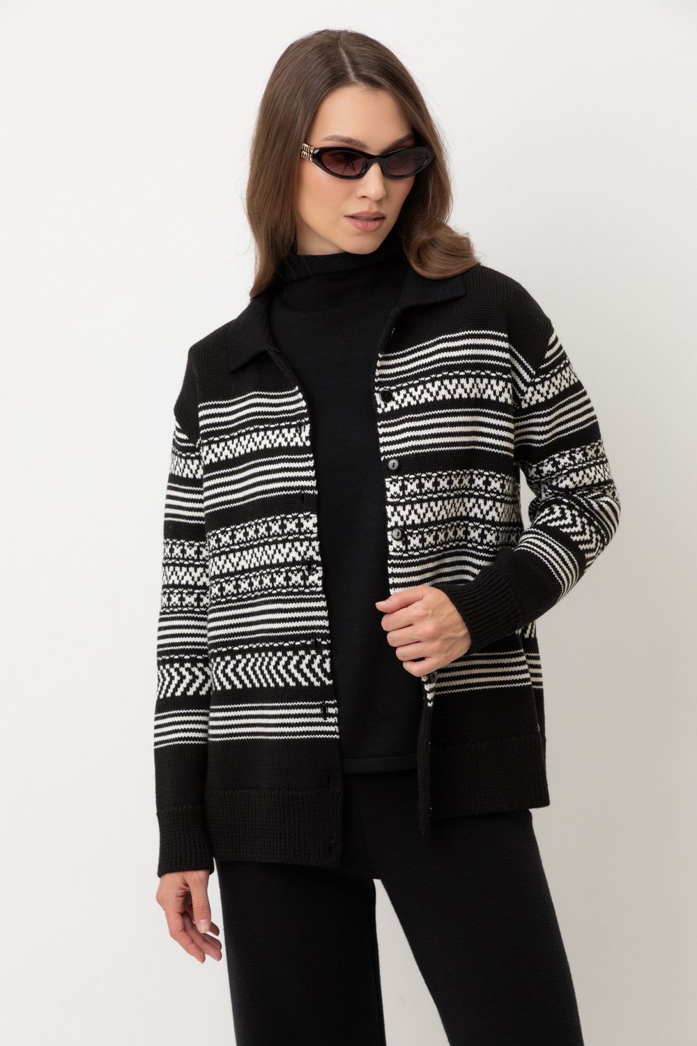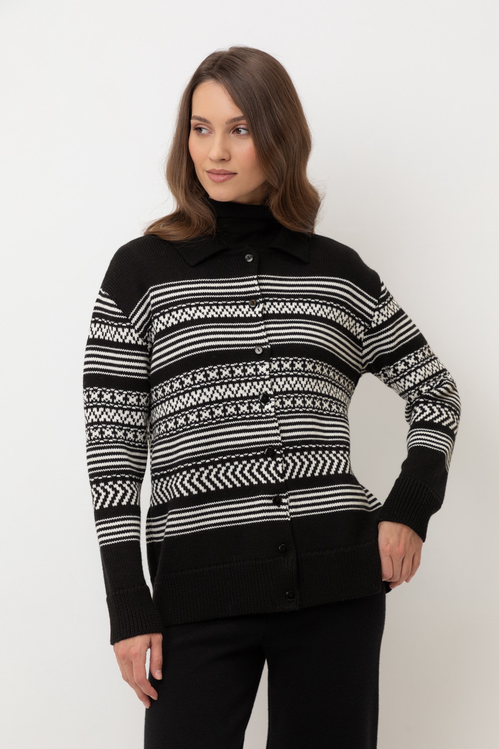 Лаконичный кардиган в скандинаском стиле из премиальной пряжи, созданный с использованием инновационной технологии смешанного волокна. Деликатное сочетание шерсти и акрила обеспечивает непревзойденный комфорт: изделие нежно облегает фигуру, гарантирует мягкость прикосновения и сохраняет безупречную форму.