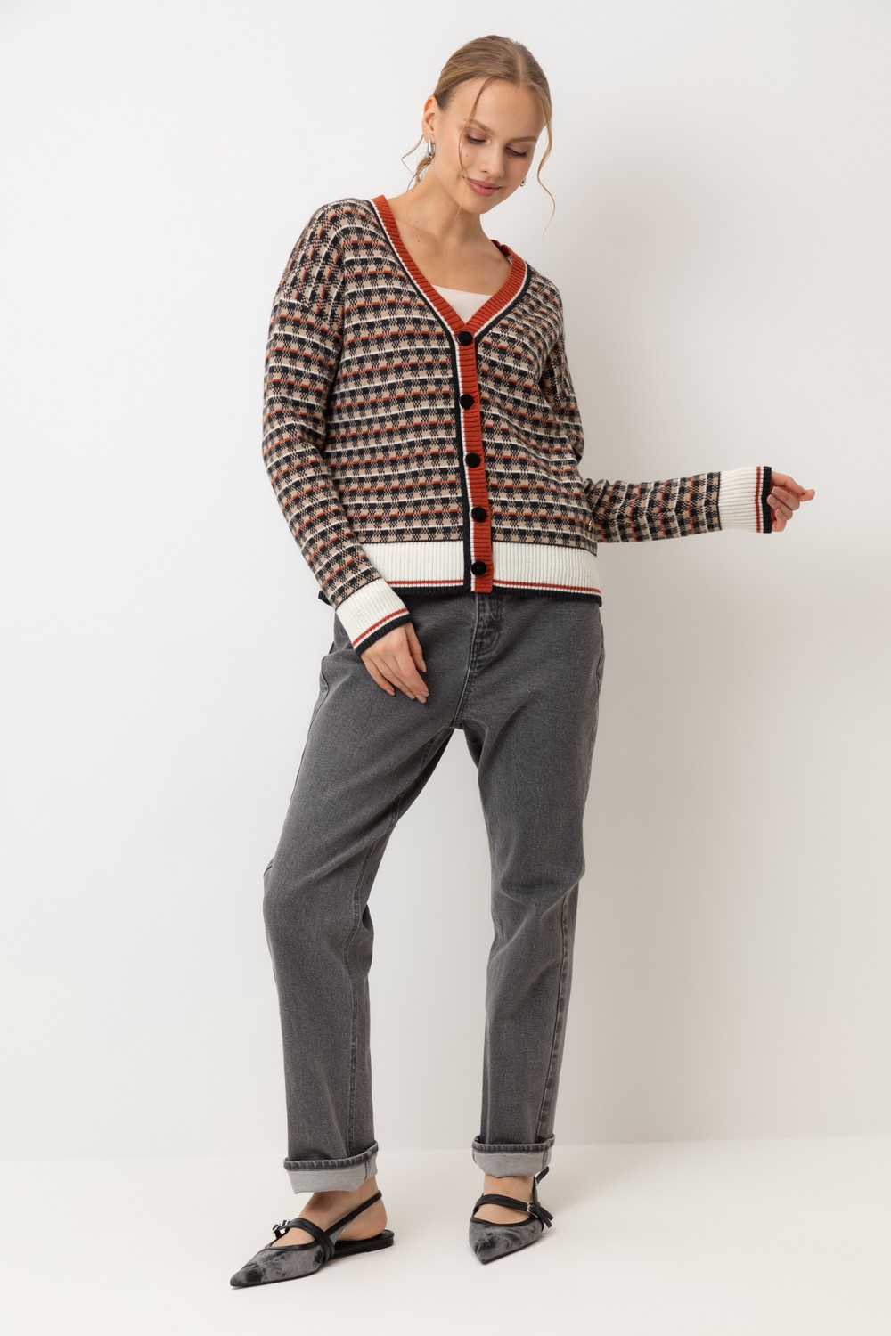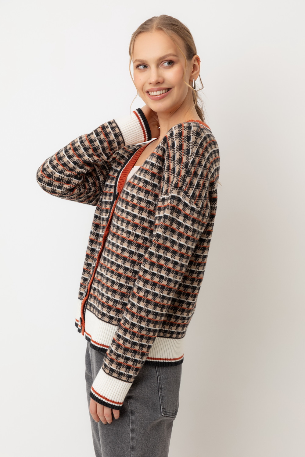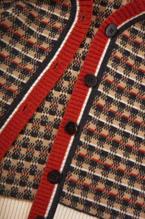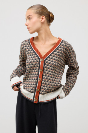 Элегантный кардиган в кантри-стиле изготовлен из высококачественной пряжи с применением передовой технологии смешанных волокон. Изысканное сочетание шерсти и акрила создает непревзойденный комфорт: модель деликатно подчеркивает силуэт, обеспечивает нежное прикосновение к коже и сохраняет безупречный внешний вид.